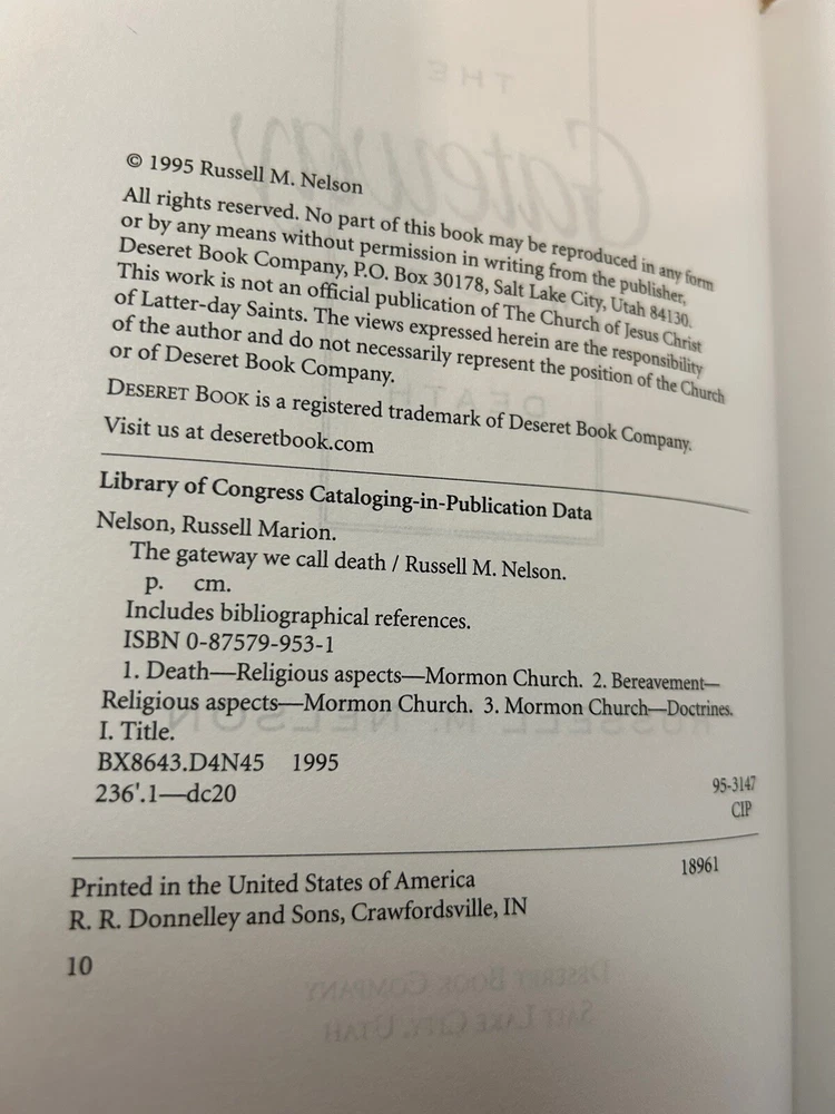 Book Title:Gateway We Call DeathGenre:Family & Relationships, ReligionISBN:9780875799537Number of Pages:128 Pagesgtin13:9780875799537Format:HardcoverTopic:Christianity / Church of Jesus Christ of Latter-Day Saints (Mormon), Death, Grief, BereavementLanguage:EnglishAuthor:Russell M. NelsonPublication Year:1995Publisher:Deseret Book Company