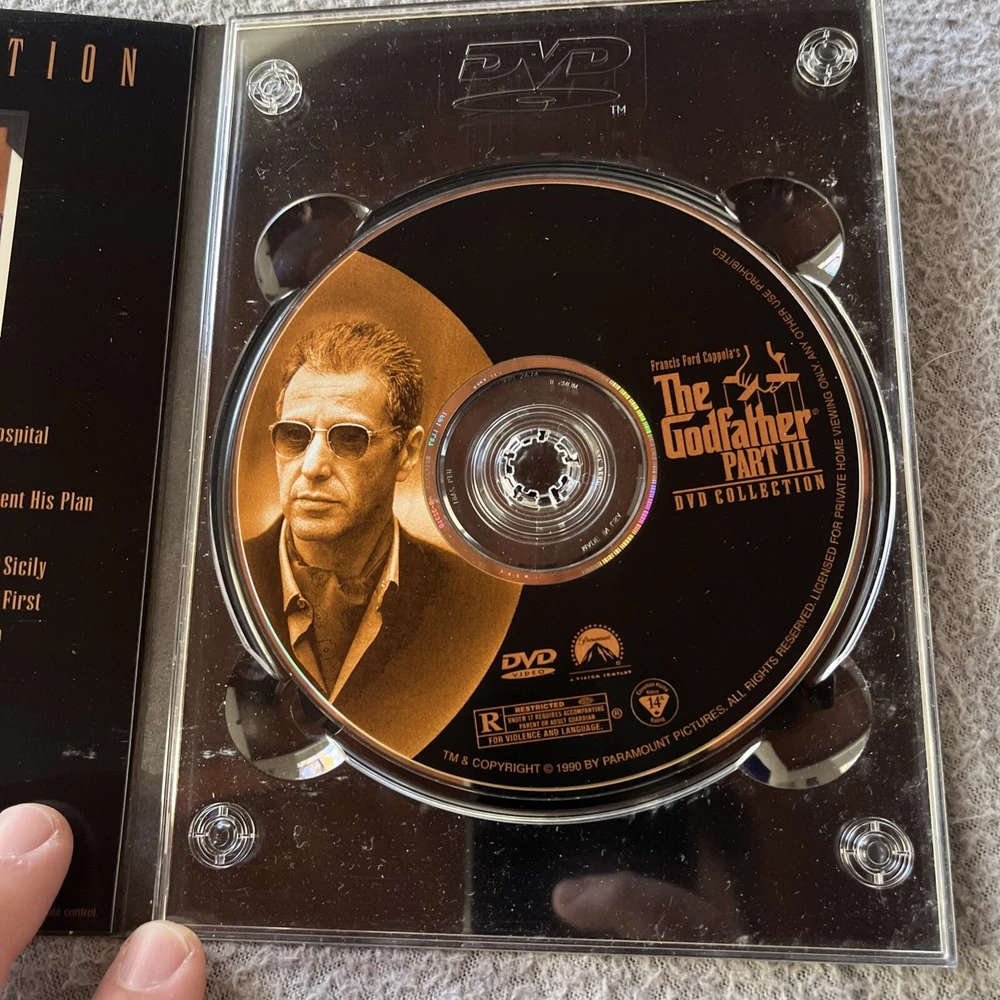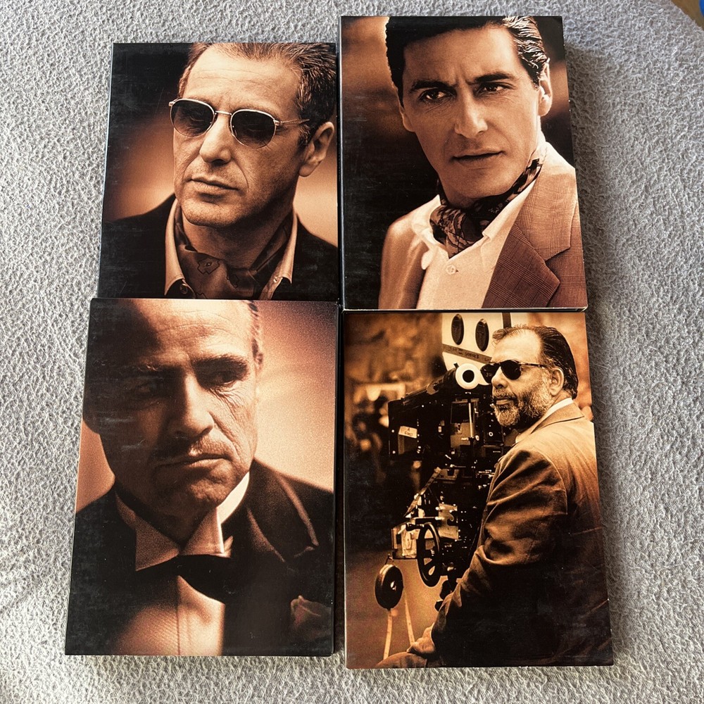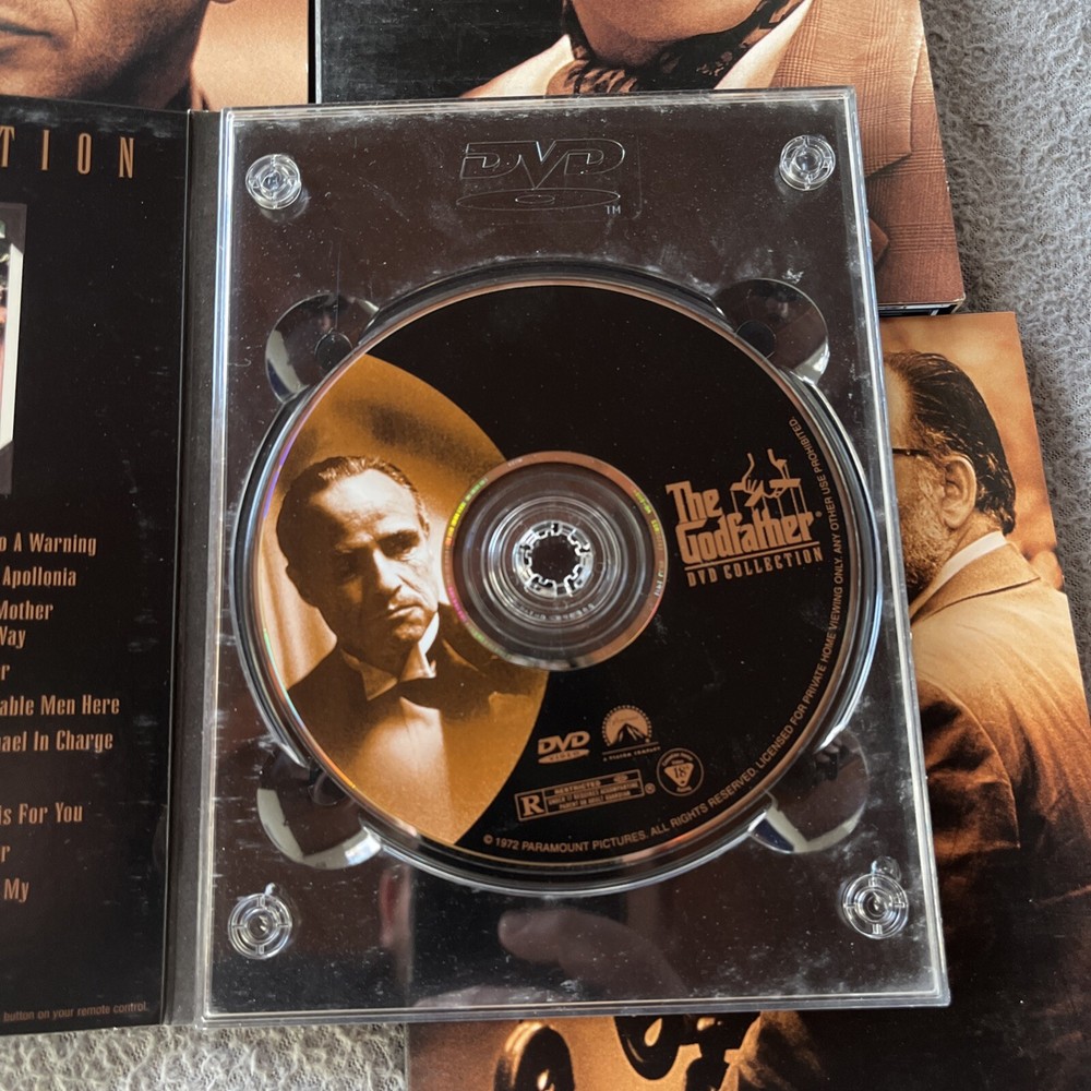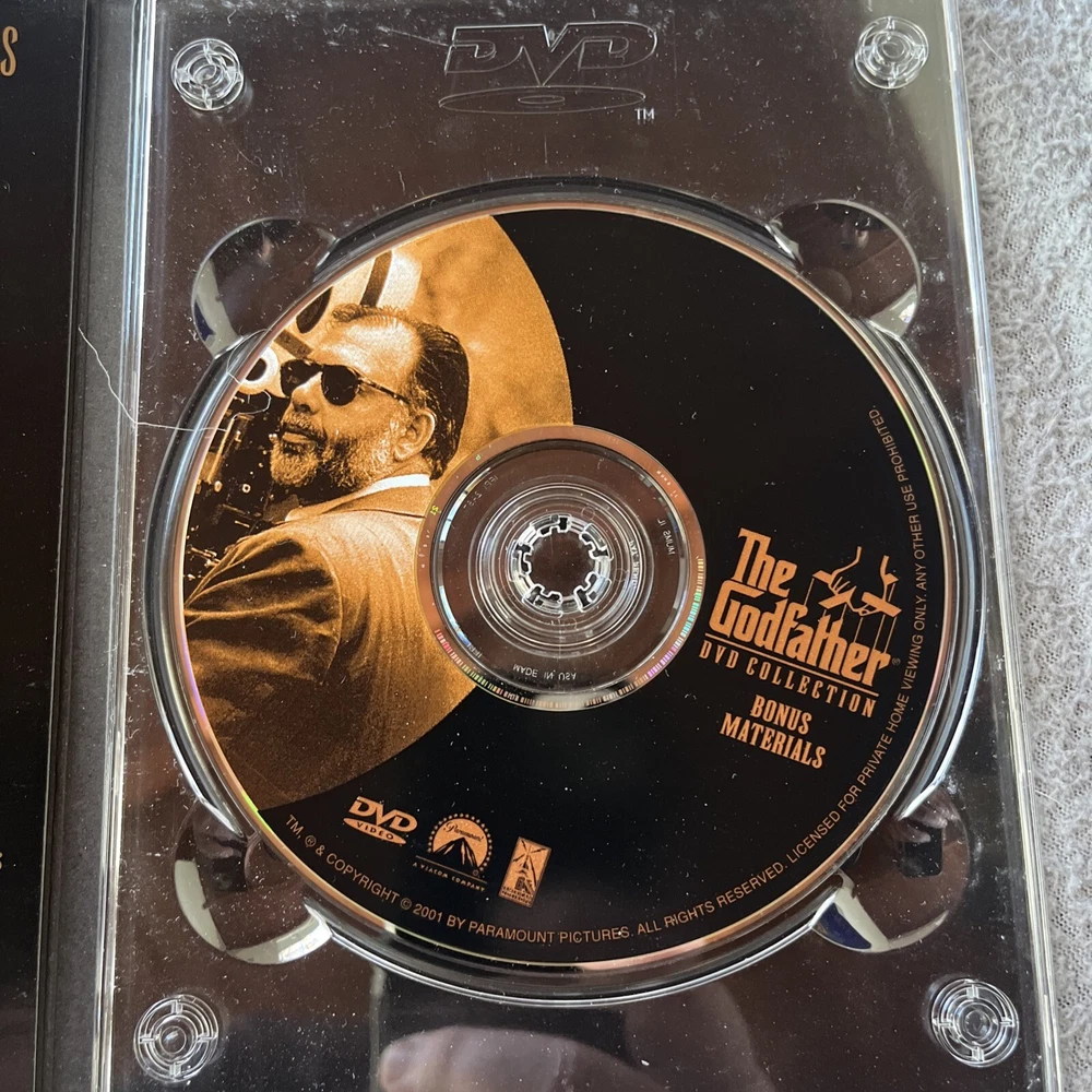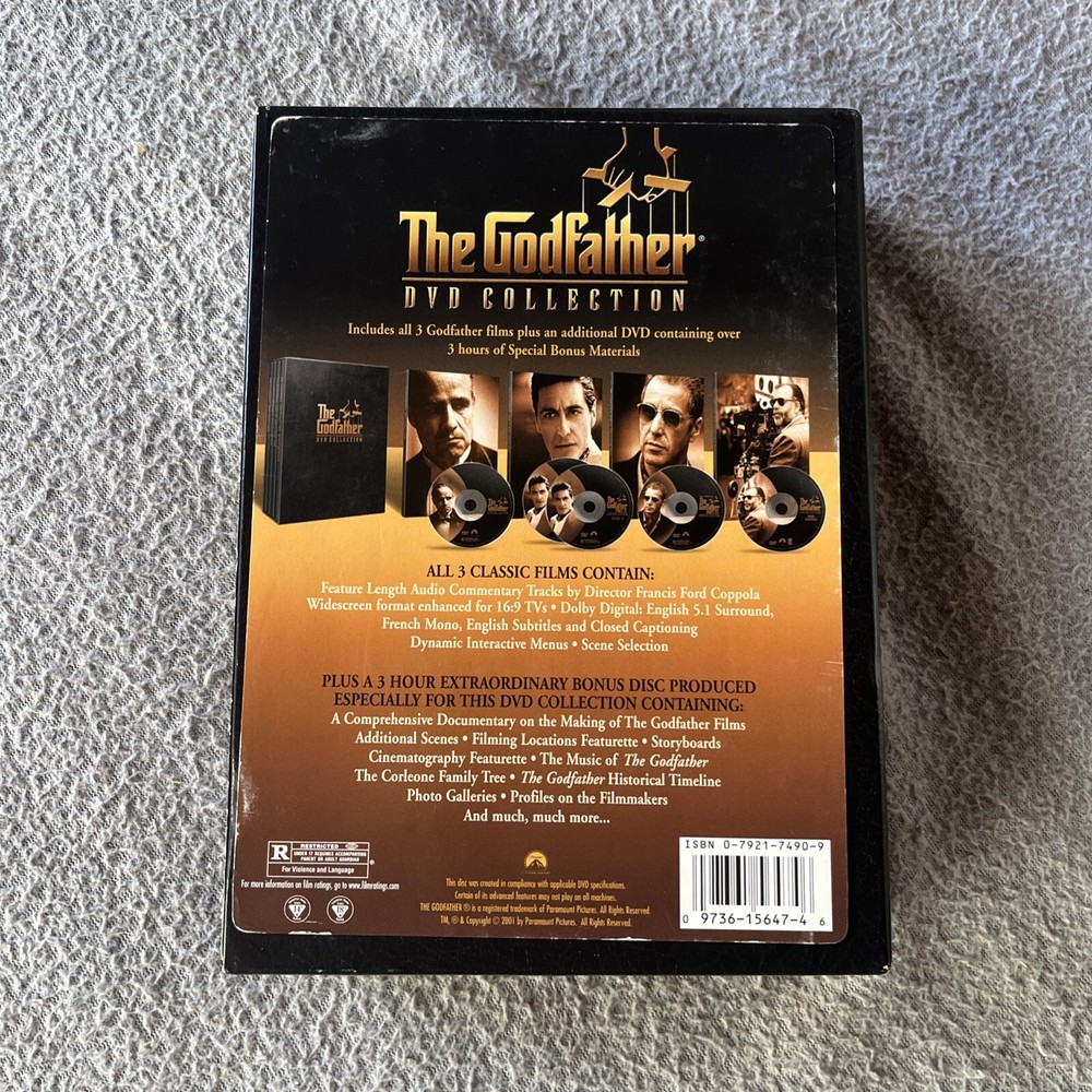 The Godfather DVD Collection in great condition. All DVDs are tested and working great. Perfect for anyone who wants to relive this epic saga. The product is "The Godfather DVD Collection I II III 2001, 5-Disc Set - Bonus Material." This set includes all three films in "The Godfather" series, featuring a star-studded cast including Al Pacino, James Caan, Marlon Brando, and Robert De Niro. The movies are in English with a crime sub-genre and a rating of R. This Collector's Edition Box Set also includes bonus material, making it a comprehensive collection for fans of the iconic film series.