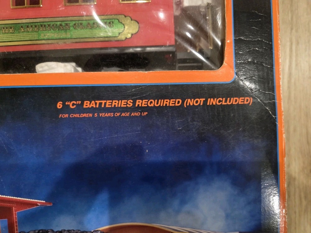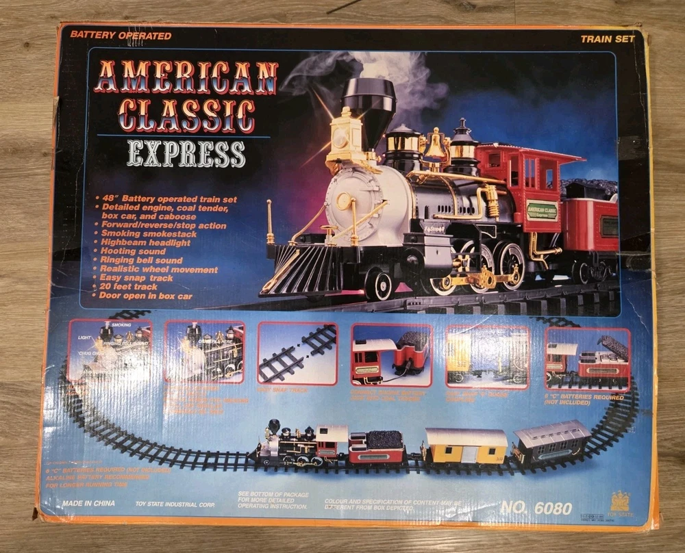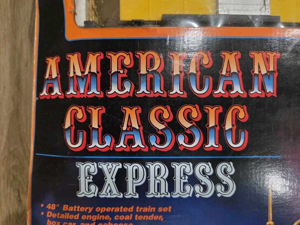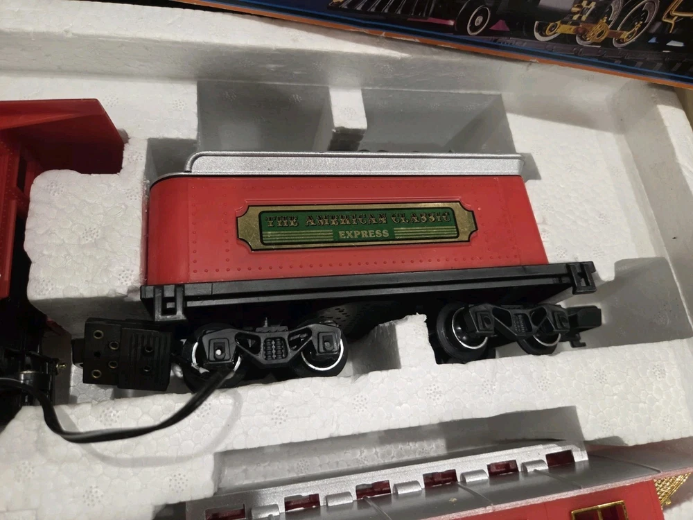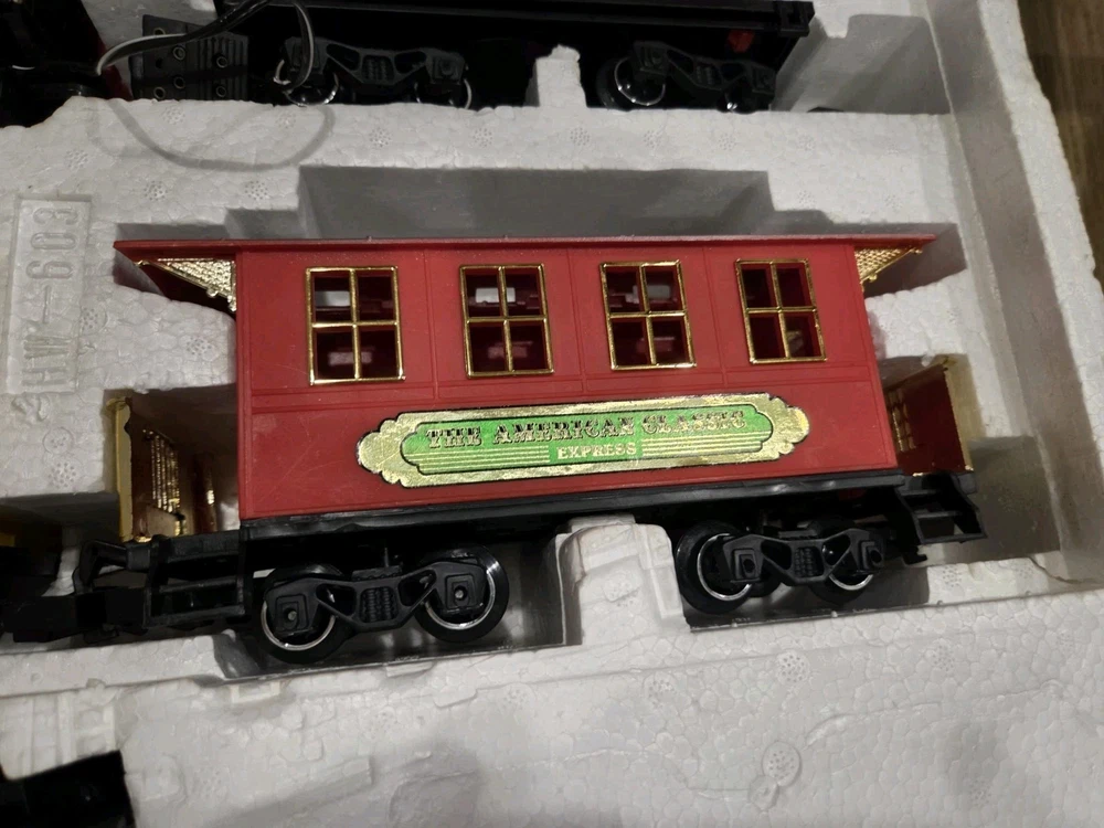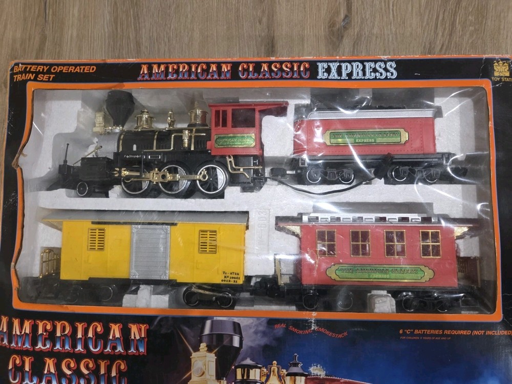 The Great American Express Train Set with a smoking engine by New Bright Industrial Co., Ltd is a vintage collectible from 1996. This complete set includes a passenger car, locomotive, tracks, caboose, and coal tender, all in G Scale. The set features an analog control system and a corporate roadname of Great American Express, making it a unique addition to any model railroads and trains collection. With its detailed scenery and fun features like the smoking engine, this toy set is sure to delight collectors and train enthusiasts alike.