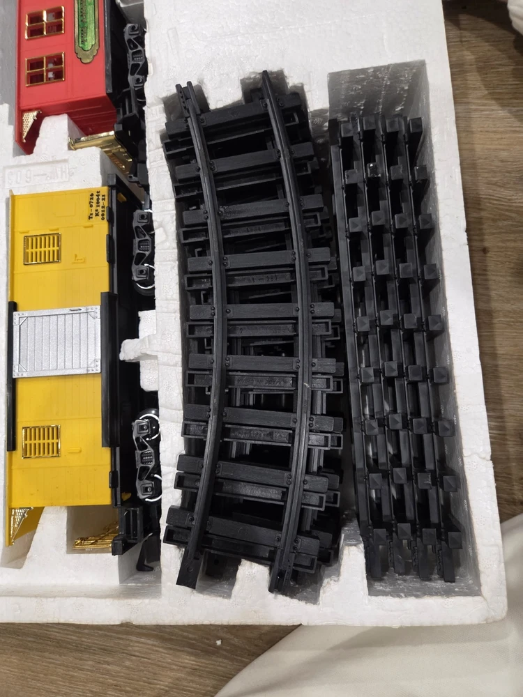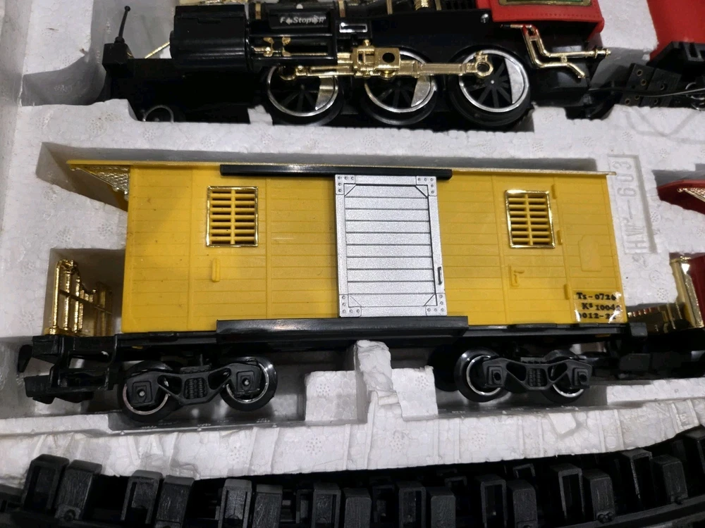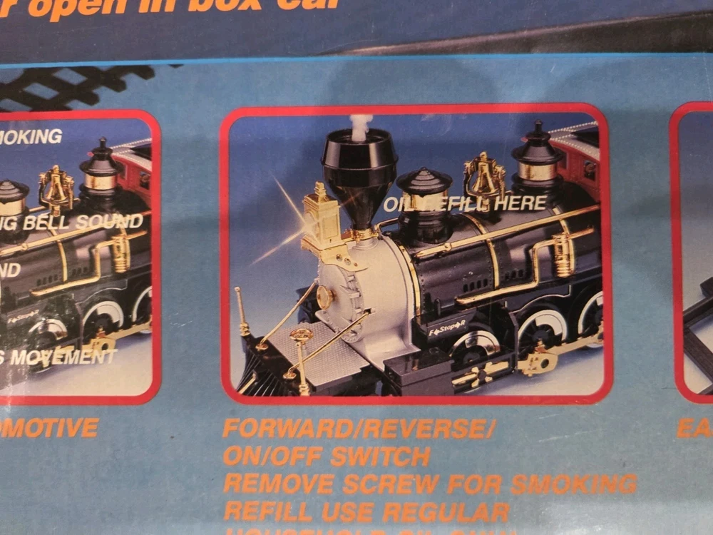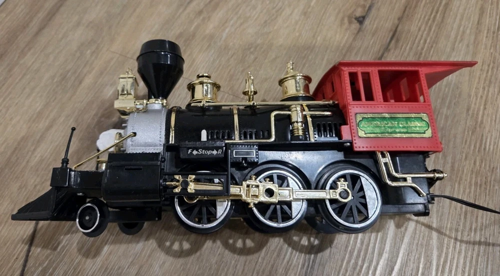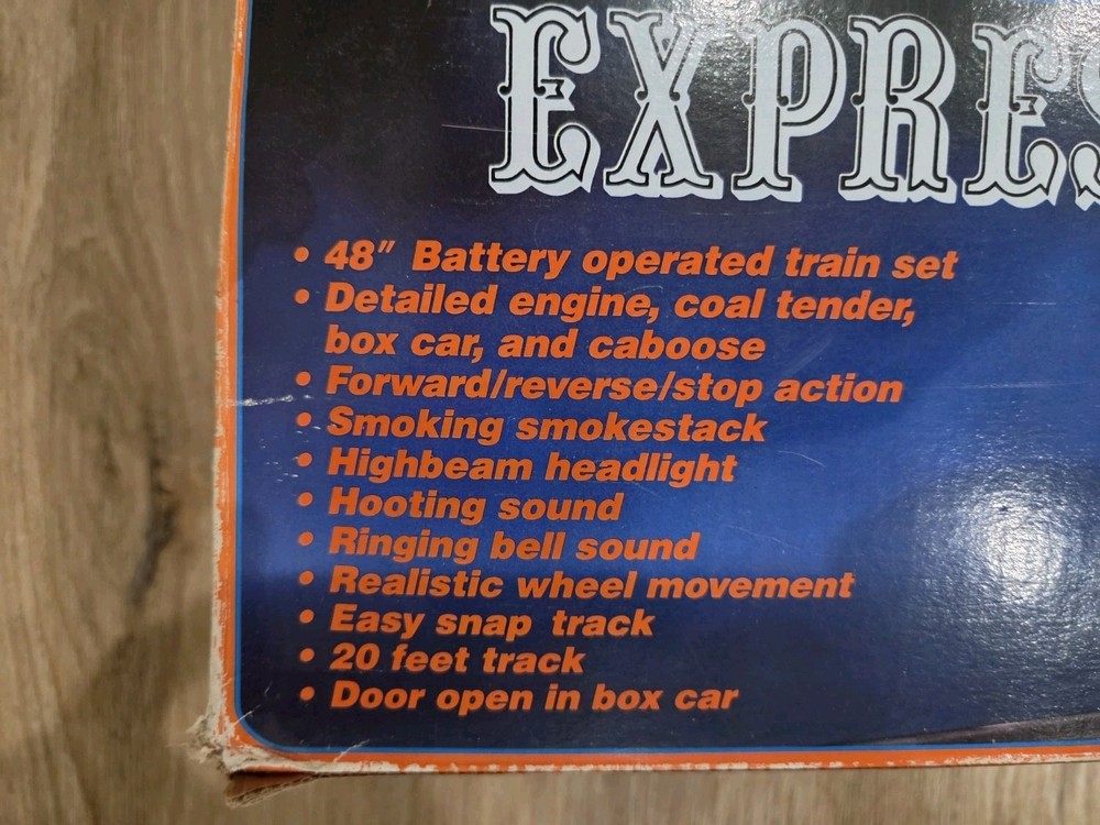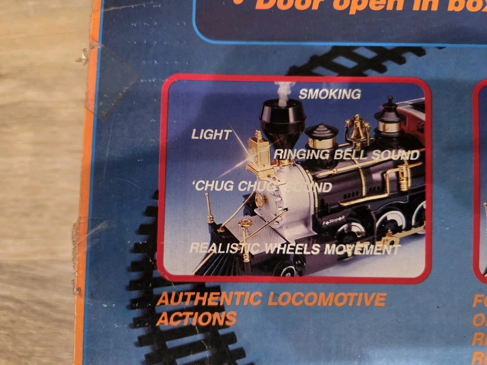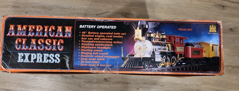 The Great American Express Train Set with a smoking engine by New Bright Industrial Co., Ltd is a vintage collectible from 1996. This complete set includes a passenger car, locomotive, tracks, caboose, and coal tender, all in G Scale. The set features an analog control system and a corporate roadname of Great American Express, making it a unique addition to any model railroads and trains collection. With its detailed scenery and fun features like the smoking engine, this toy set is sure to delight collectors and train enthusiasts alike.
