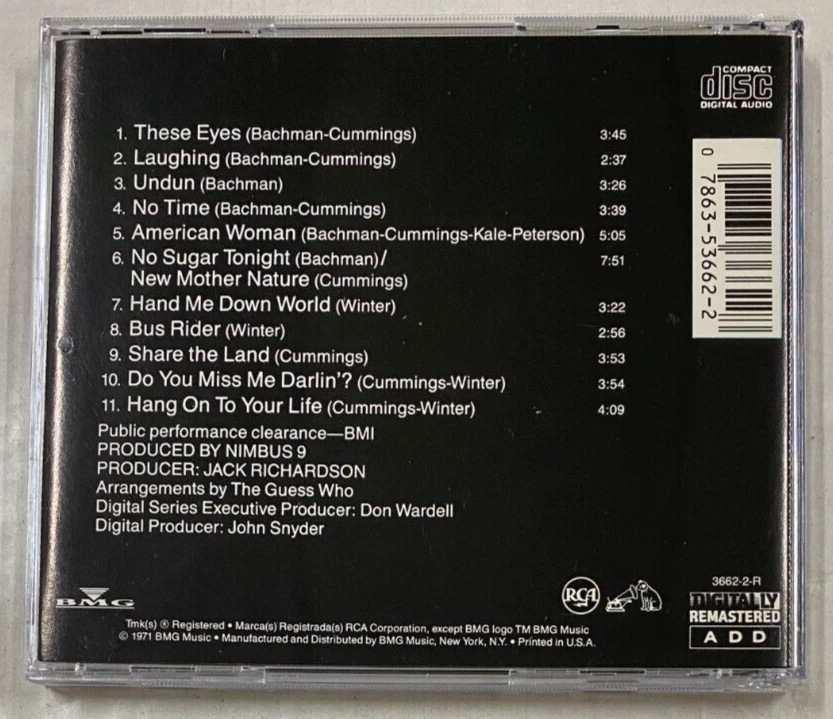 Tracklist 1 These Eyes 3:45 2 Laughing 2:37 3 Undun 3:26 4 No Time 3:39 5 American Woman 5:05 6 No Sugar Tonight / New Mother Nature 4:50 7 Hand Me Down World 3:22 8 Bus Rider 2:56 9 Share The Land 3:53 10 Do You Miss Me Darlin'? 3:54 11 Hang On To Your Life 4:09