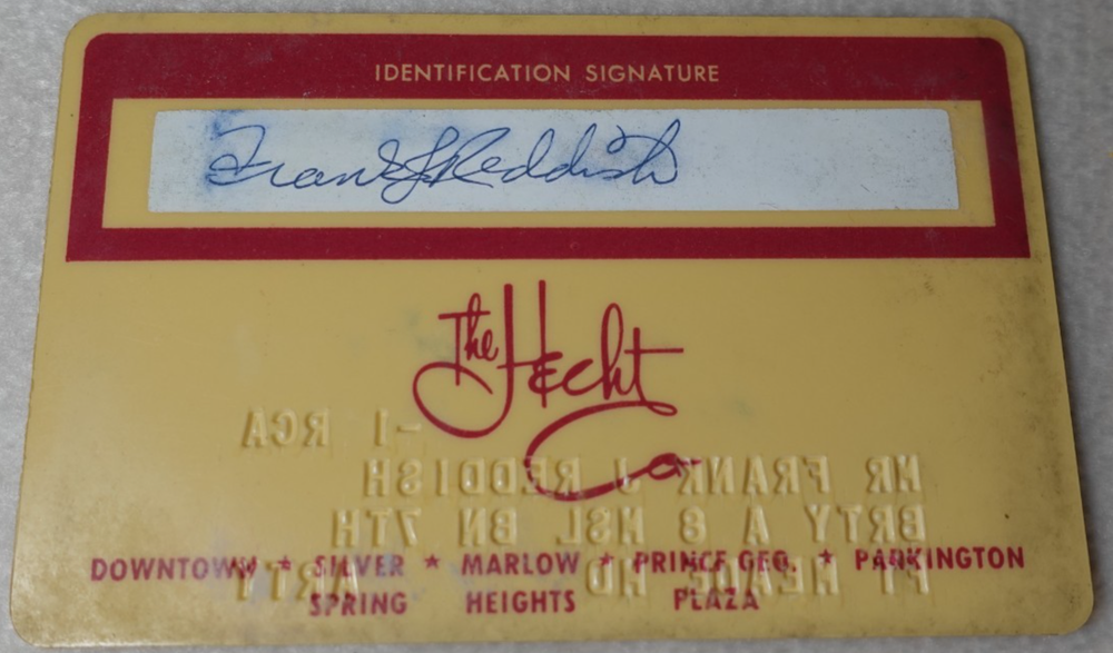 The Hecht Department Store Hecht's Washington DC Vintage Charge Account Card Measures approximately 2 1/8" x 3 3/8". Item is in vintage, used condition with surface scratches, surface scuffing, dinged edges and corners, staining, age discoloration and marks. Please see photos for more information on condition and ask any questions you may have.