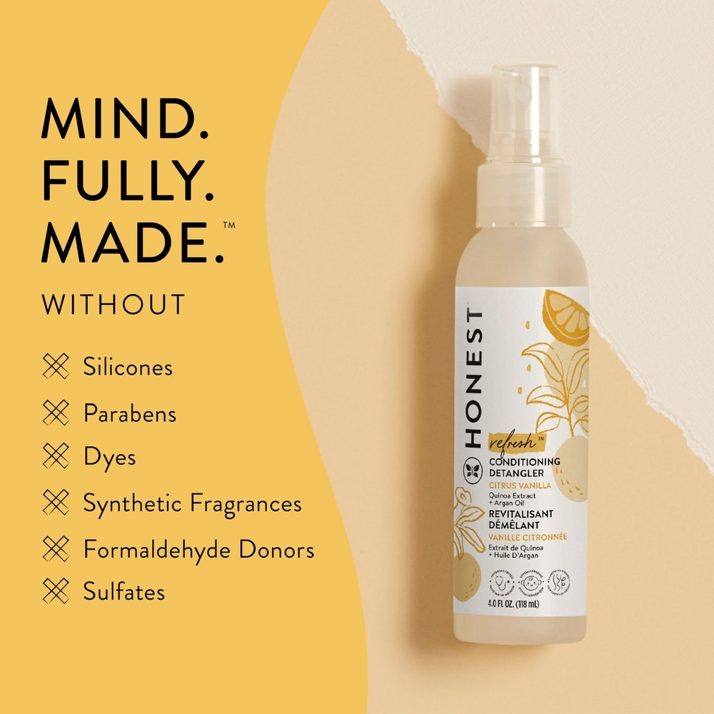 The Honest Company Conditioning 4 Fl Oz (Pack of 1), Sweet Orange Vanilla Product Details LIGHTWEIGHT HYDRATION: Leave-in lightweight conditioning hair detangler provides lightweight hydration leaving hair more manageable and feeling soft, smooth, and moisturized. Taming your mane is a breeze. SAFE FOR SENSITIVE SKIN: Designed for all skin types and safe for those with sensitive skin, this tear-free, gentle formula is Cruelty Free, Vegan, Dermatologist Tested, Toxicologist Audited, and Hypoallergenic. DAILY DETANGLING: Designed for daily use on all hair types from straight to curly and suitable for kiddos and grown-ups of all ages. NATURALLY DERIVED: Made with Chamomile extract, Calendula extract, Quinoa extract, and Jojoba protein. MADE WITHOUT: Parabens, Silicones, Synthetic Fragrances, Dyes, Formaldehyde Donors, and Sulfates. Refresh (Citrus Vanilla): Leave it to our (all-time fave) leave in conditioner spray to get the job done. Tame your mane with our Refresh Detangling spray featuring a nourishing blend of naturally-derived ingredients like argan oil, jojoba protein, shea butter and quinoa extracts that help soften and smooth hair. Silken and separate strands the easy way with our detangler designed for all hair types, in a convenient spray bottle that can easily be taken on-the-go.