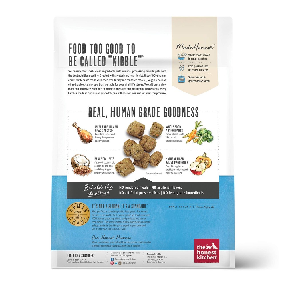 The Honest Kitchen Whole Food Clusters Grain Free Turkey 16 Fl Oz (Pack of 1) Product Details COMPLETE & BALANCED FOR PUPPIES & ADULT DOGS: Serve as a complete meal or healthy topper to dogs of all life stages, breeds and sizes including adults, puppies and gestation. WET DOG FOOD PATE: Kettle-cooked in small batches for a hearty, smooth texture. WE SAY NO TO: This recipe contains no gums, carrageenan, feed grade ingredients, meat meals, fillers, GMO ingredients, artificial flavors or artificial preservatives. NATURAL & MADE IN THE USA: Butcher Block Pâté is made with ingredients you’d recognize from your own kitchen, and made in the USA with trusted sources from around the world. HUMAN GRADE: Unlike most pet food, which is feed grade, this recipe is 100% human grade – made with human grade ingredients and produced in a human food facility. That means higher quality ingredients and more safety standards, just like you'd expect from your own food. We believe that human grade, minimally processed whole foods provide pets the best nutrition possible. Created with a veterinary nutritionist, these 100% human grade clusters are made with real whole foods you’d recognize from your own kitchen. They’re MadeHonest with human grade, nutrient-rich ingredients, cold pressed, roasted and dehydrated to maintain the nutrients, aroma and taste of whole foods. Whole Food Clusters give you the same scoop & serve convenience, while giving your pets minimally processed, 100% human grade taste and nutrition.*Substantiated by In-Home AAFCO Feeding TrialABOUT THE HONEST KITCHENFounded in 2002 as the first human grade food for pets, we believe that real, whole foods provide pets with the best nutrition possible. That’s why all our foods are made with the same quality and safety standards as people food (and with ingredients you can find in your kitchen). It’s what we call The Honest Difference, and we can’t wait for you to see the difference it makes!