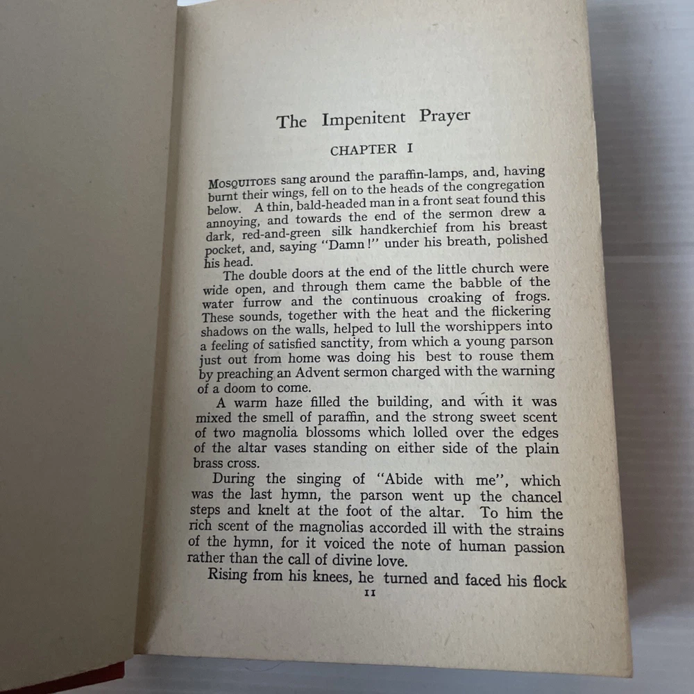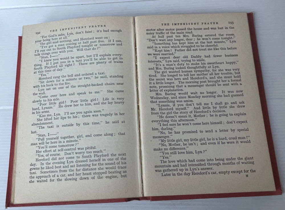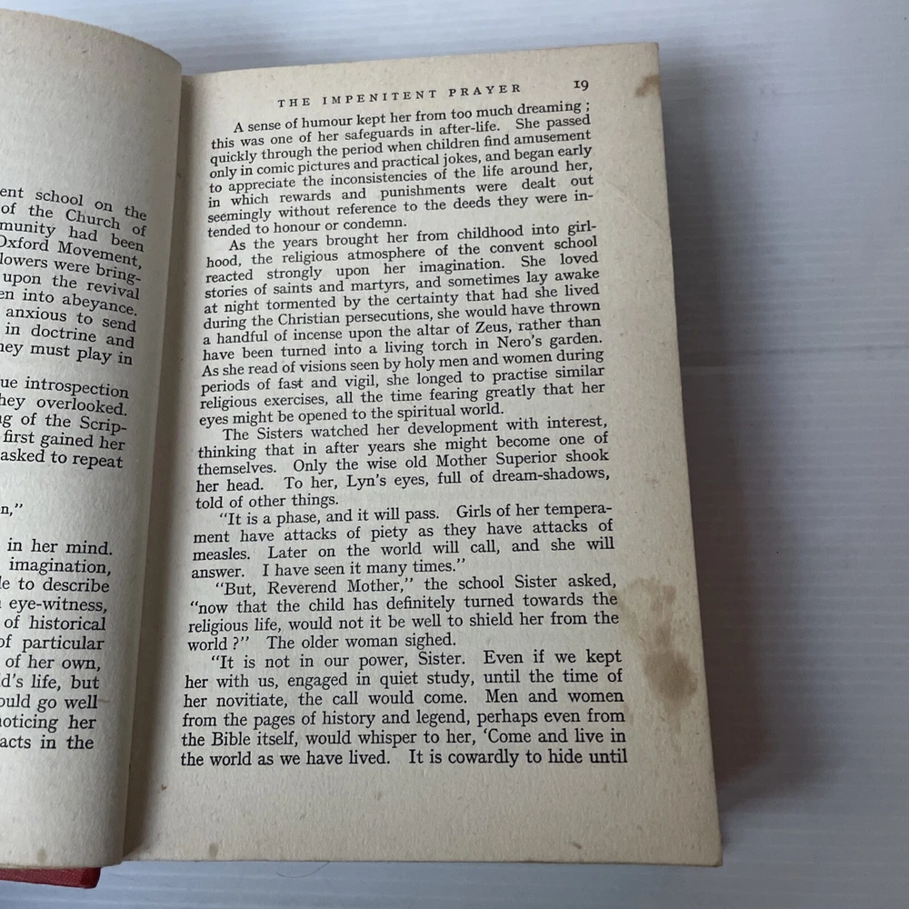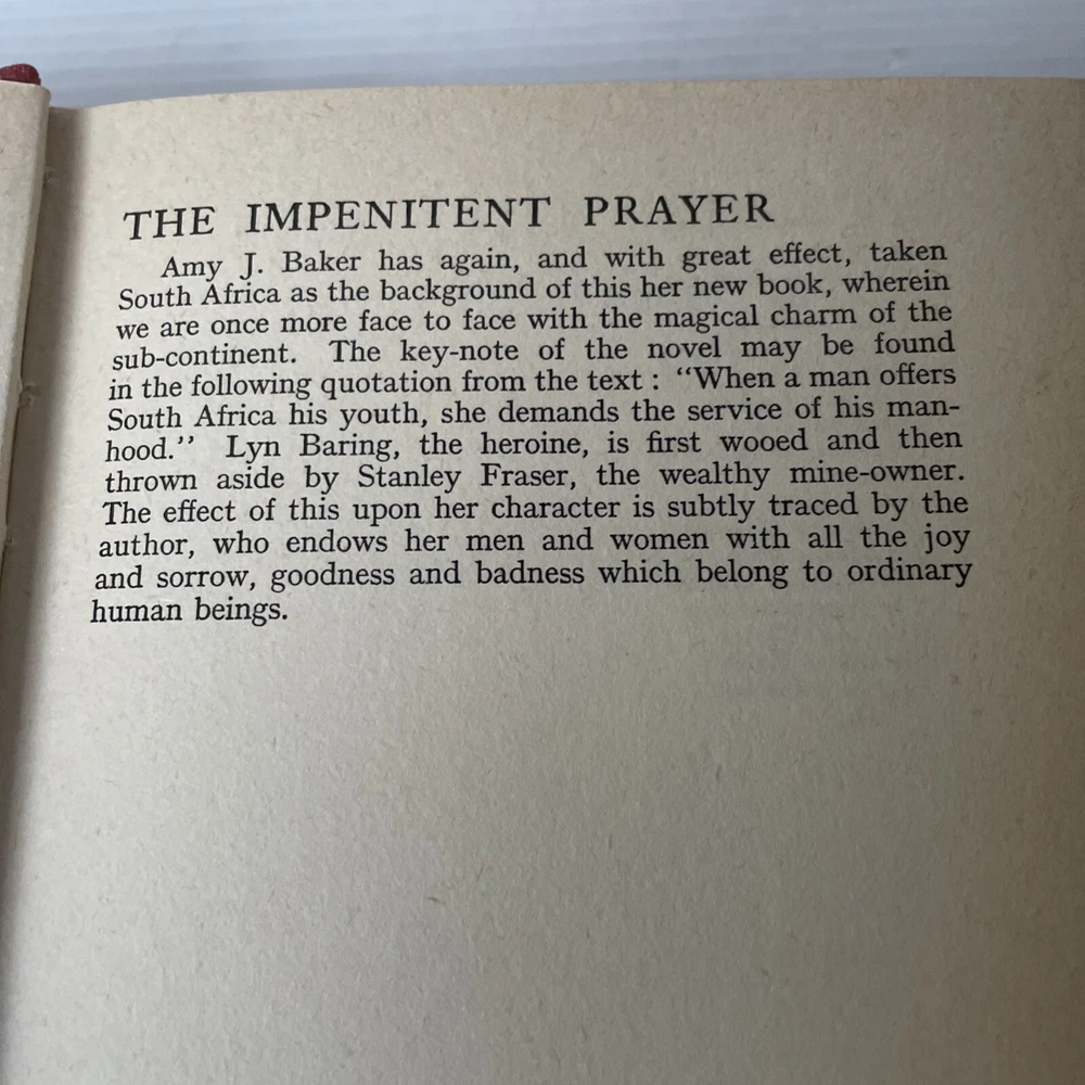 The Impenitent Prayer Amy J. Baker Vintage Hardback Book South Africa Fiction With great effect, taken South Africa as the background of this her new book, wherein we are once more face to face with the magical charm of the sub-continent. The key-note of the novel may be found in the following quotation from the text: "When a man offers South Africa his youth, she demands the service of his man-hood." Lyn Baring, the heroine, is first wooed and then thrown aside by Stanley Fraser, the wealthy mine-owner. The effect of this upon her character is subtly traced by the author, who endows her men and women with all the joy and sorrow, goodness and badness which belong to ordinary human beings. Condition: VINTAGE GOOD - Photo's of Actual Product - See photos to confirm condition All pages present and a fully intact cover. Shows significant wear, including wear to the boards & textblock. Binding intact, shelfwear and bumps. NO Dustjacket present, Some tanning & foxing. ------------------- Please See my eBay shop for more Modern & Vintage Books Add as a favourite seller, new stock added daily Thanks for looking