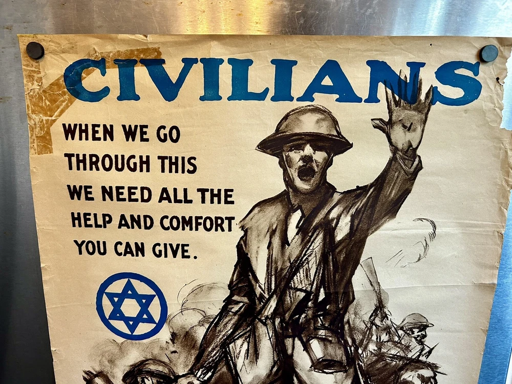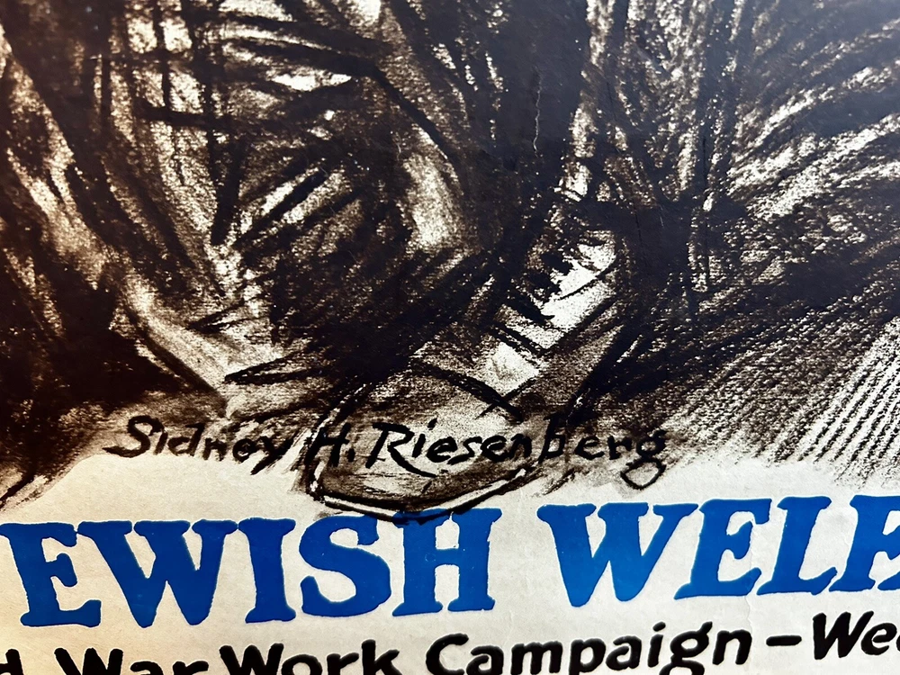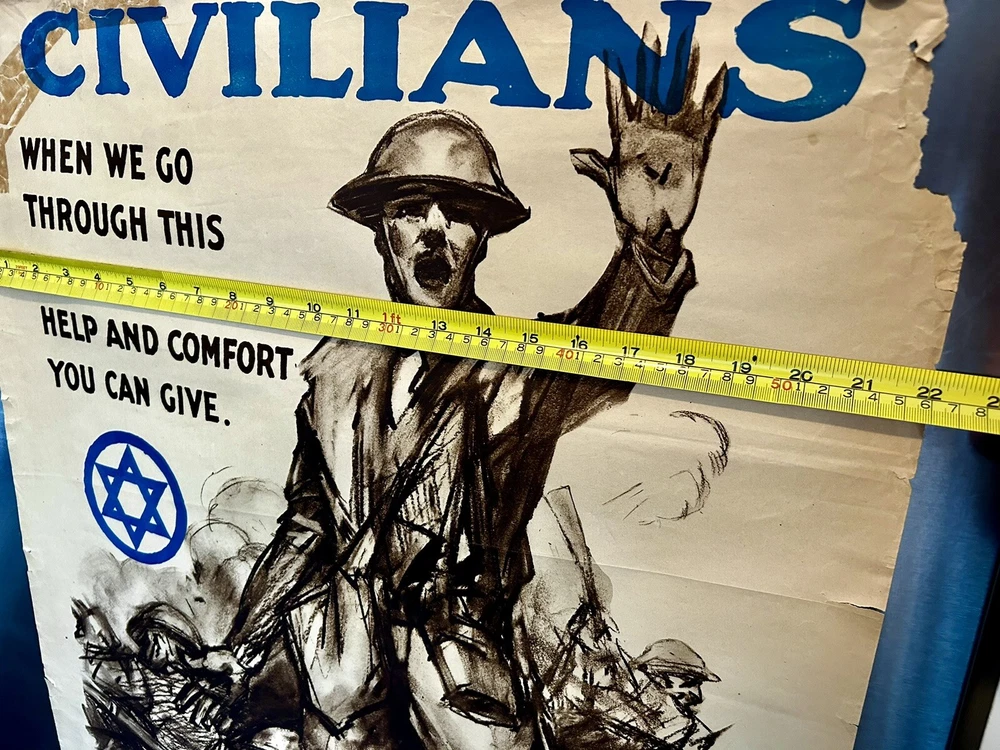 Rare world war 1 Jewish related poster Measures 22” x 34” Has some visible tears on corners / edges but still would display amazingly framed “Civilians, when we go through this we need all the help and comfort you can give - The Jewish Welfare Board” was one of many posters issued during World War I. This poster was commissioned by the National Jewish Welfare Board. The board was formed on April 9, 1917 and became one of the six organizations that formed the United Service Organization during WWI. According to The Vintage Poster, the board provided Jewish soldiers with kosher food, Passover meals, holiday services, and trans-denominational prayer books, while also training Rabbis to serve as aids in the Jewish military. According to the Jewish Virtual Library, approximately 250,000 Jewish Americans fought during World War 1, about 3,500 died, and 12,000 were wounded. This poster was commissioned in 1918 from Sidney Riesenberg, an American artist and illustrator from New York who was known especially for his oil paintings. This picture of a soldier prompts civilians to join the war effort and help fund the Jewish Welfare Board. This poster was created as a lithographic print at the time of its distribution.” (Typed by computer) This is an original 1918 World War 1 poster from the Jewish Welfare Board featuring Sidney Riesenberg. The poster is a unique piece of militaria that showcases the theme of the Jewish community during World War 1. It is a valuable addition to any collection of original period items from the United States. The poster is in excellent shape and is a great conversation starter for any history enthusiast.