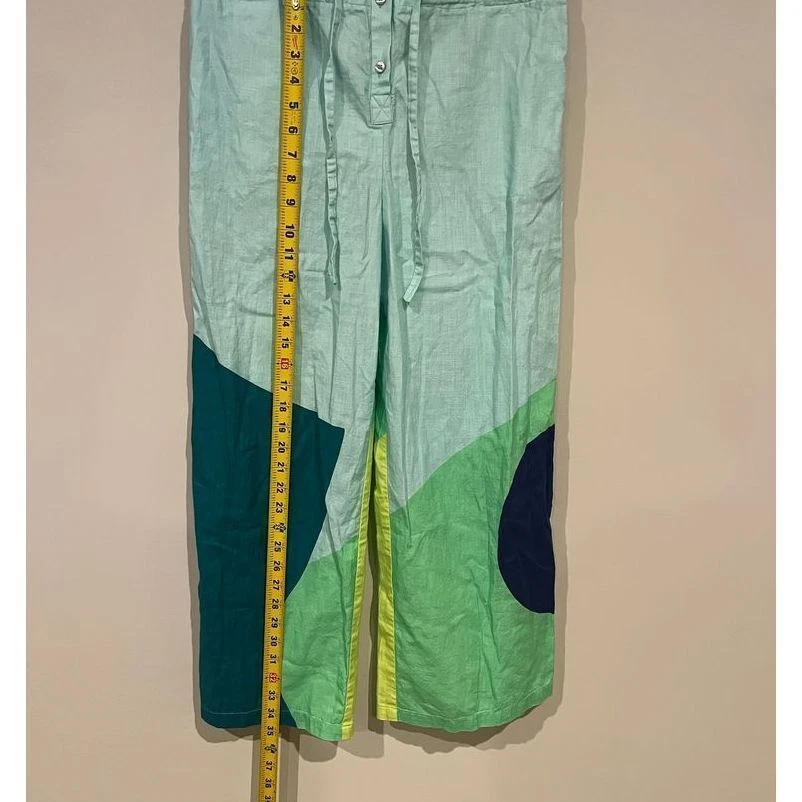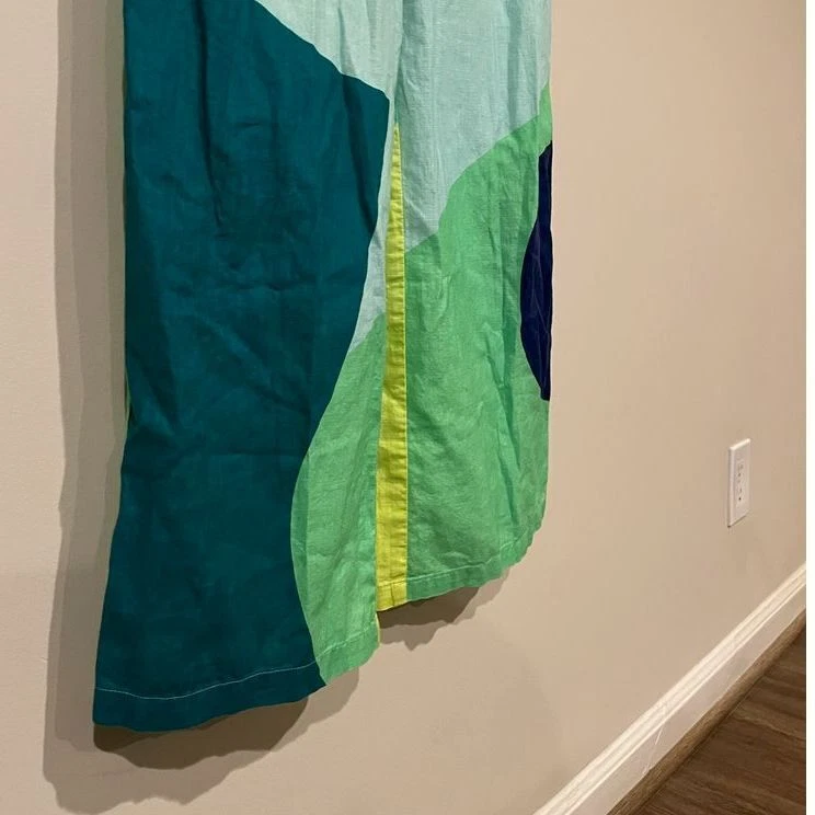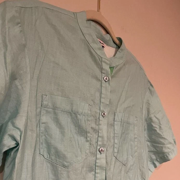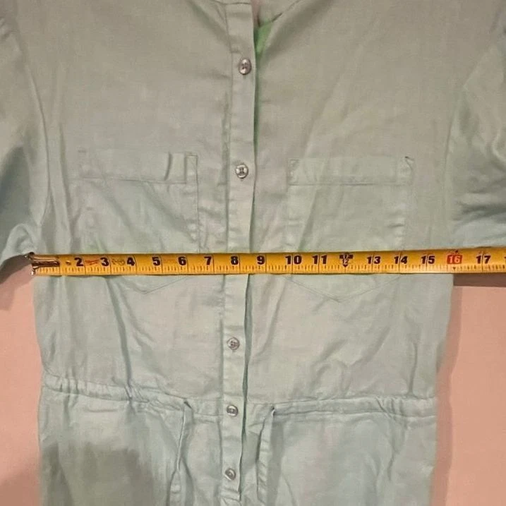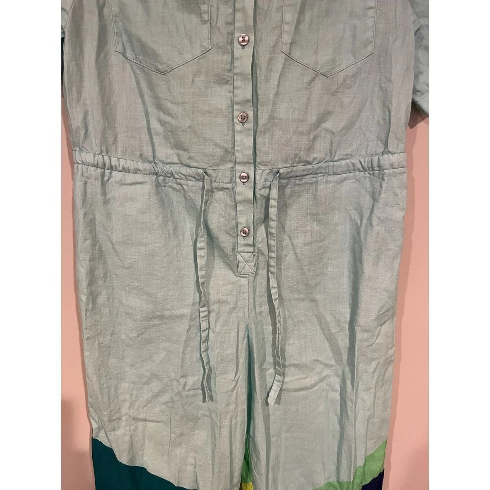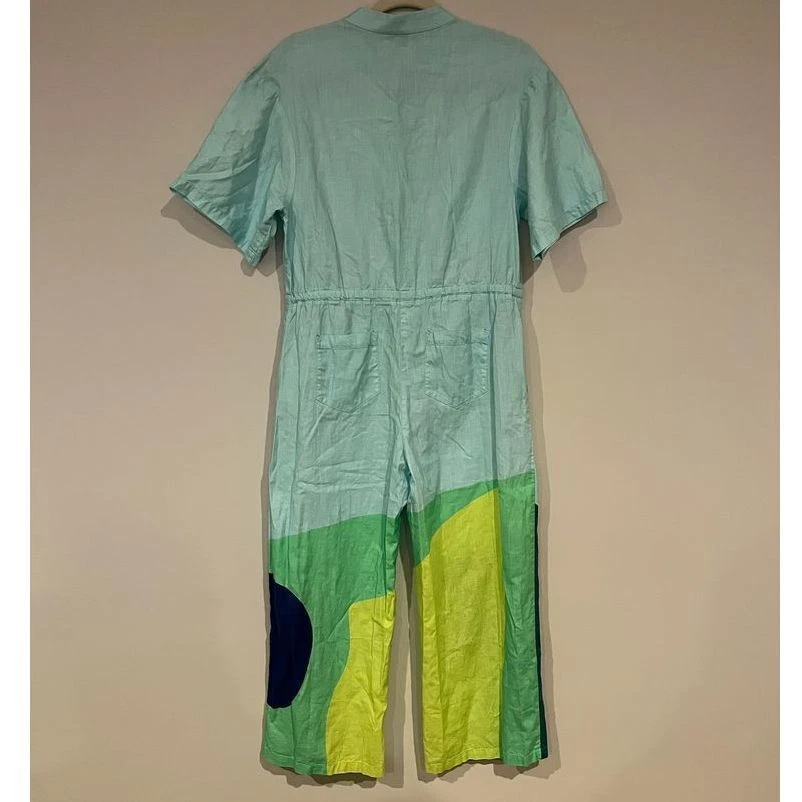 Make a statement in this unique color block jumpsuit! Features a chic mandarin collar, short sleeves, and button-front closure. The mint green base is beautifully complemented by bold geometric color blocking in teal, lime, and navy. Elastic waist provides comfort and definition. Perfect for summer brunches, art gallery visits, or creative workplace environments. The modern design offers both style and comfort. Department: Women Type: One-Piece Color: Multicolor Style: Jumpsuit Fabric Type: Woven Material: 100% Cotton, Cotton Sleeve Length: Short Sleeve Pattern: Colorblock Accents: Button Occasion: Casual, Business, Workwear Number of Pieces: 1 Piece Keywords: color block jumpsuit, mint green jumpsuit, geometric pattern, button front, mandarin collar, short sleeve, elastic waist, retro style, modern fashion, summer jumpsuit, cotton jumpsuit