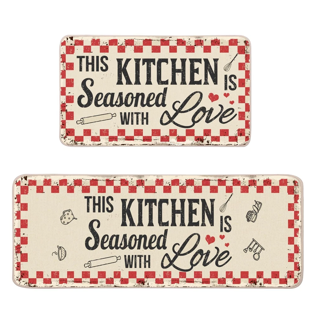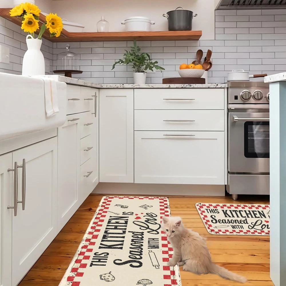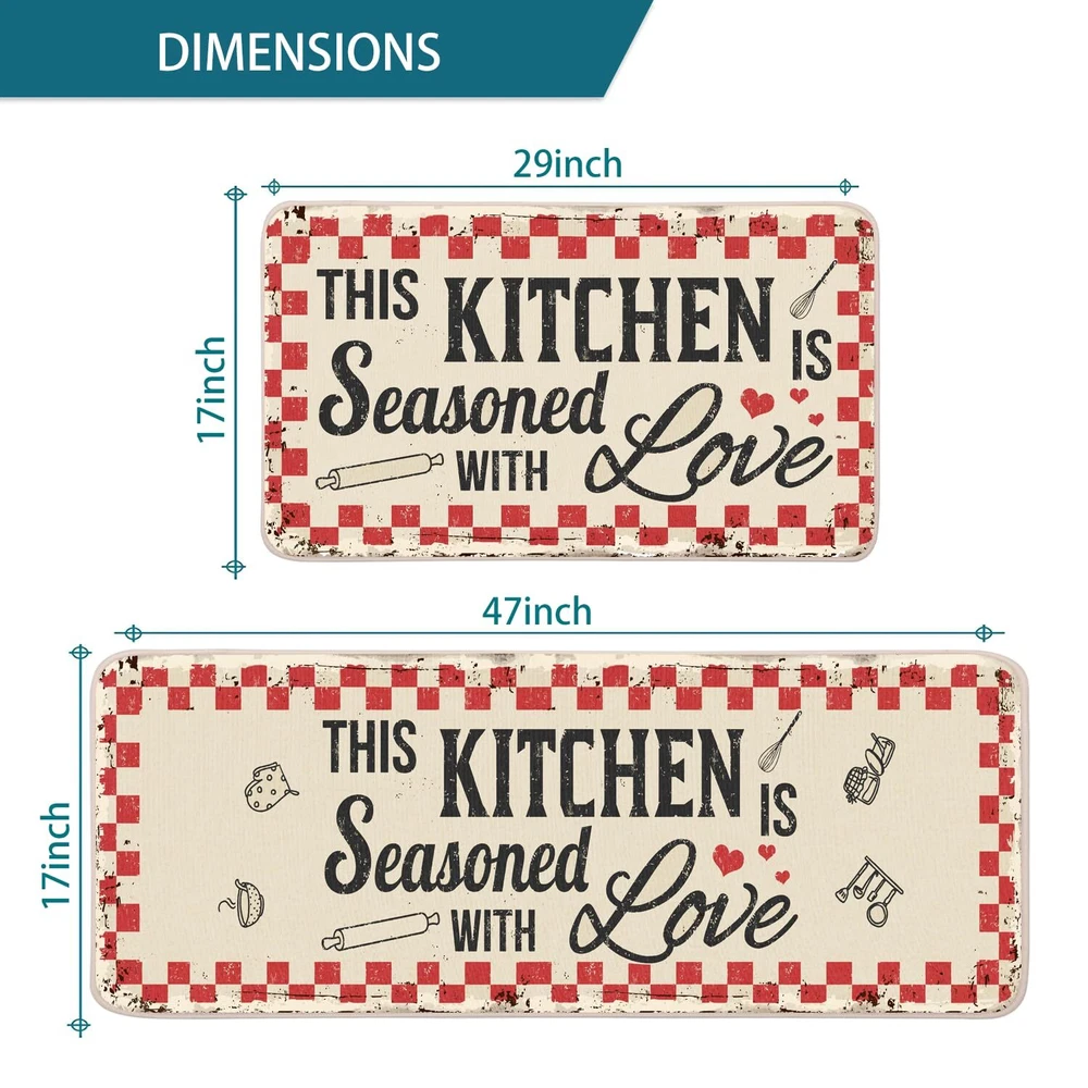This kitchen mats set includes 2 floor mats: Measures 17" x 29" and 17" x 47", features 0.25" slim. Material: Made of 5% polyester and 95% rubber backing, which is not easy to fade and reliable to use. Durable and Non-slip : Backed with non-slip rubber and topped with polyester felt that is low-profile to reduce chances of tripping. Easy to clean: No scrubbing needed. Just spray off with a hose or use a sponge and mild detergent to clean off dirt. Awesome Kitchen Decor: These mats with funny quotes will make a beautiful addition to your kitchen, dining room, craft rooms and office spaces, as well as a perfect housewarming gift.