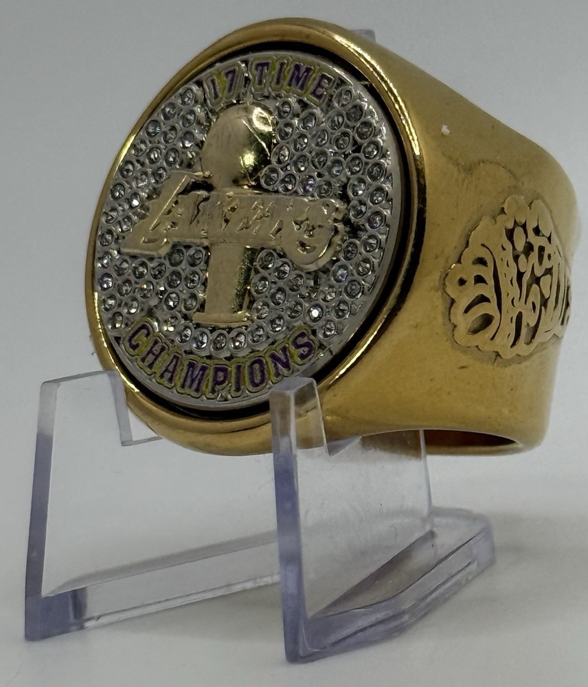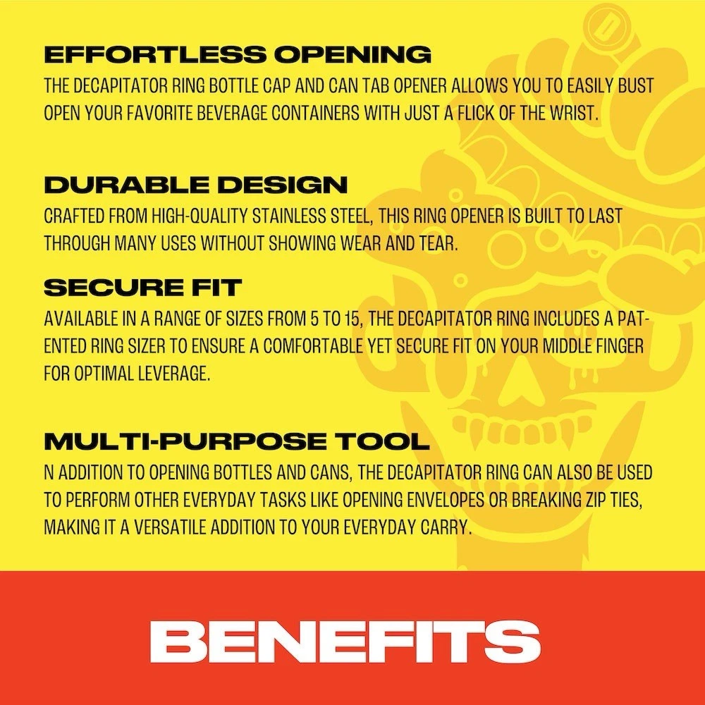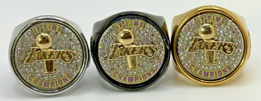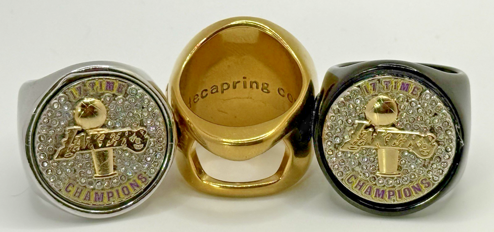 The LA Lakers de CAP itator ring bottle cap & can tab opener! The ONLY Replica Championship ring that cracks open your favorite beverage of bottle caps and can tabs with just a flick of your wrist. Made of durable polished stainless steel. Made with 52 cubic zirconia's. All rings come with our patented ring sizer to fit all middle fingers. The ring goes on your middle finger for best leverage. NFL, Fantasy football, Awards. Trophies At checkout please choose between a black, Silver or Gold ring Comes in sizes 6-15 with our patented ring sizer. What's better than cracking open your favorite beverage with just a flick of your wrist. ✅ Effortless Opening: The Original deCAPitator ring bottle cap and can tab opener allows you to easily bust open your favorite beverage containers with just a flick of the wrist. ✅ Durable Design: Crafted from high-quality black stainless steel, this ring opener is built to last through many uses without showing wear and tear. ✅ Secure Fit: Available in a range of sizes from 5 to 15, the deCAPitator ring includes a patented ring sizer to ensure a comfortable yet secure fit on your middle finger for optimal leverage. ✅ Eye-Catching Style: Featuring logo design embossed and painted set in silver tone, this functional ring is sure to spark conversation and turn heads wherever you go. ✅ Multipurpose Tool: In addition to opening bottles and cans, the deCAPitator ring can also be used to perform other everyday tasks like opening envelopes or breaking zip ties, making it a versatile addition to your everyday carry. Unique Bottle Cap & can tab Opener: This innovative ring design allows you to effortlessly remove caps from bottles and pop-tops from cans with a simple flick of the wrist. Stylish and Functional: Crafted with a sleek, eye-catching pattern of sparkling crystals, this opener doubles as a fashionable accessory for any occasion. Compact and Portable: The compact size makes it easy to carry in your pocket, purse, or keychain for convenient access whenever you need it. Durable Construction: Made with high-quality stainless steel, this opener is built to withstand regular use and last for years to come. Versatile Utility: Whether you're enjoying a cold beverage at home, a party, or on-the-go, this multi-purpose opener ensures you're always prepared.