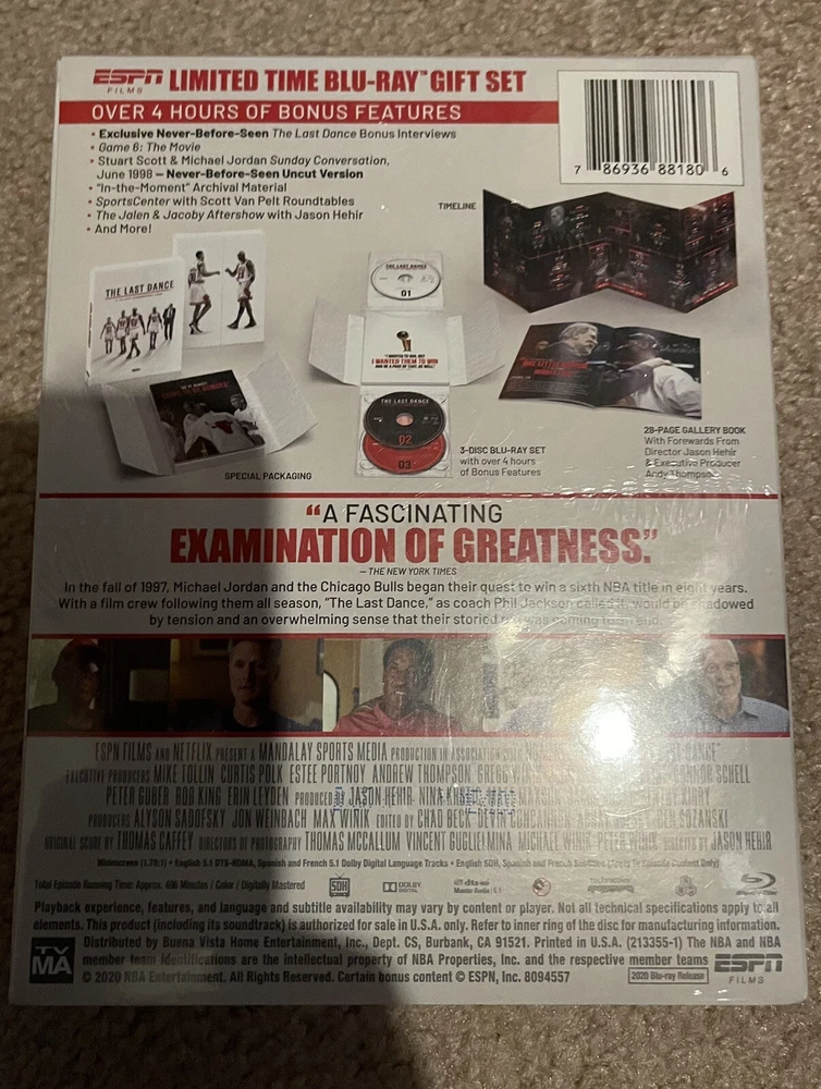 Season:Complete Series Box SetActor:Scottie Pippen, Phil Jackson, David Aldridge, Michael Jordan, Steve KerrRegion Code:Blu-ray: Region FreeFormat:Blu-ray DiscDirector:Jason HehirMovie/TV Title:The Last Dance: a Ten-Part Documentary EventUPC:0786936881806Edition:Limited Edition, Box SetLanguage:Englishgtin13:0786936881806Genre:DocumentarySub-Genre:Biography, BasketballCase Type:Cardboard Sleeve