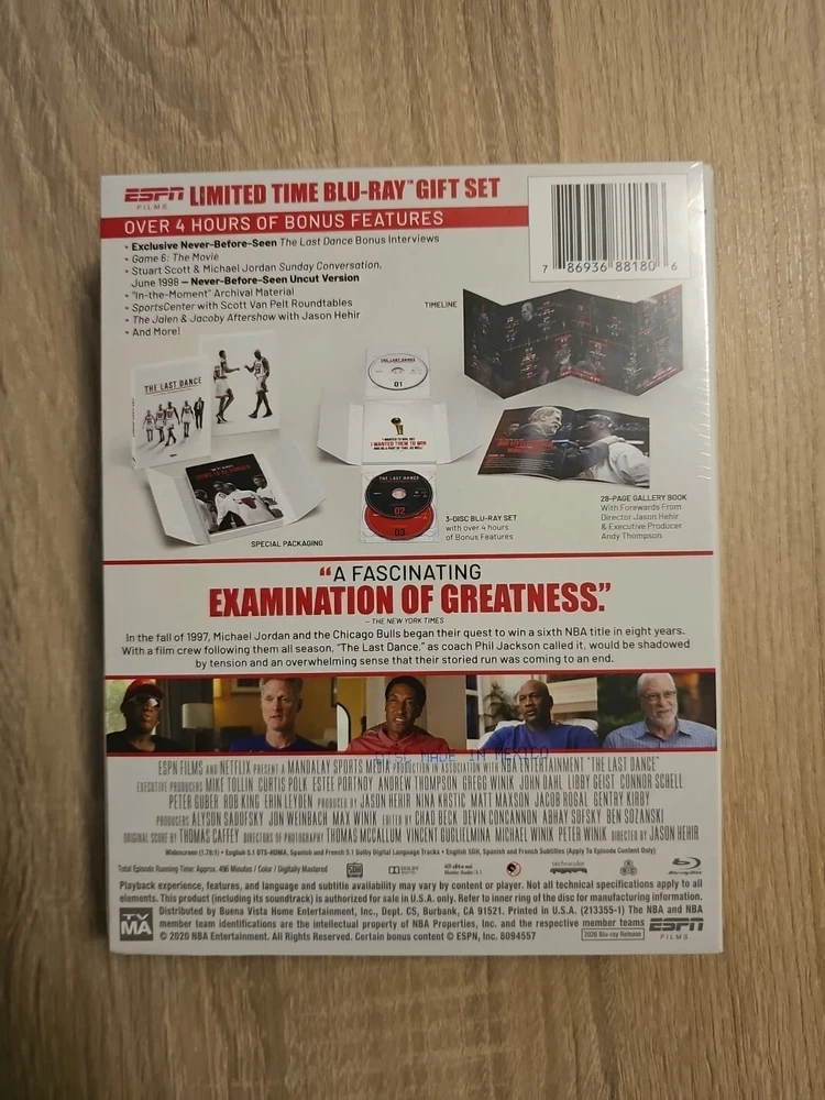 Movie/TV Title:The Last Dance: a Ten-Part Documentary EventUPC:0786936881806Sub-Genre:Biography, Basketballgtin13:0786936881806Genre:DocumentaryDirector:Jason HehirSeason:Complete Series Box SetActor:Scottie Pippen, Phil Jackson, David Aldridge, Michael Jordan, Steve KerrFormat:Blu-ray DiscRegion Code:Blu-ray: Region FreeEdition:Limited Edition, Box SetLanguage:EnglishCase Type:Cardboard Sleeve