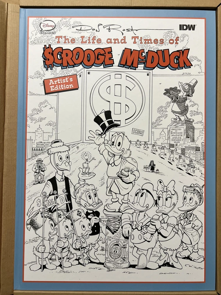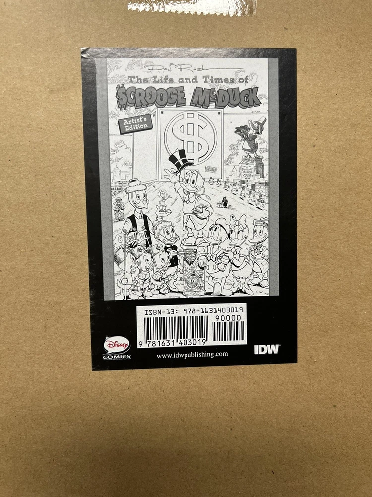 The Life and Times of Scrooge McDuck by Don Rosa Artist Edition Hardcover Disney Hardcover book is XL size measuring at 20”x 16” x 1” Don Rosa is the universally acclaimed Donald Duck and Uncle Scrooge creator and artistic heir to the remarkable legacy of the “Good Duck” artist, Carl Barks. Now, with the full cooperation and assistance of Rosa, IDW Publishing is proud to present the first volume of The Life and Times of Scrooge McDuck. Included in this edition will be a cover gallery and a selection of Rosa’s layouts done for these stories.