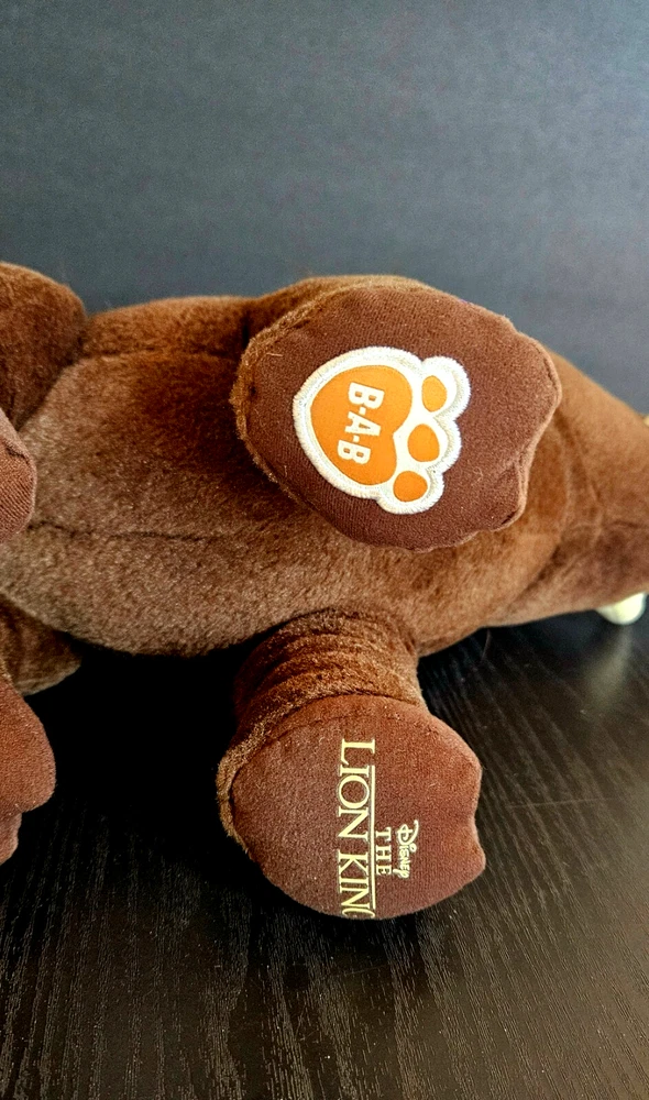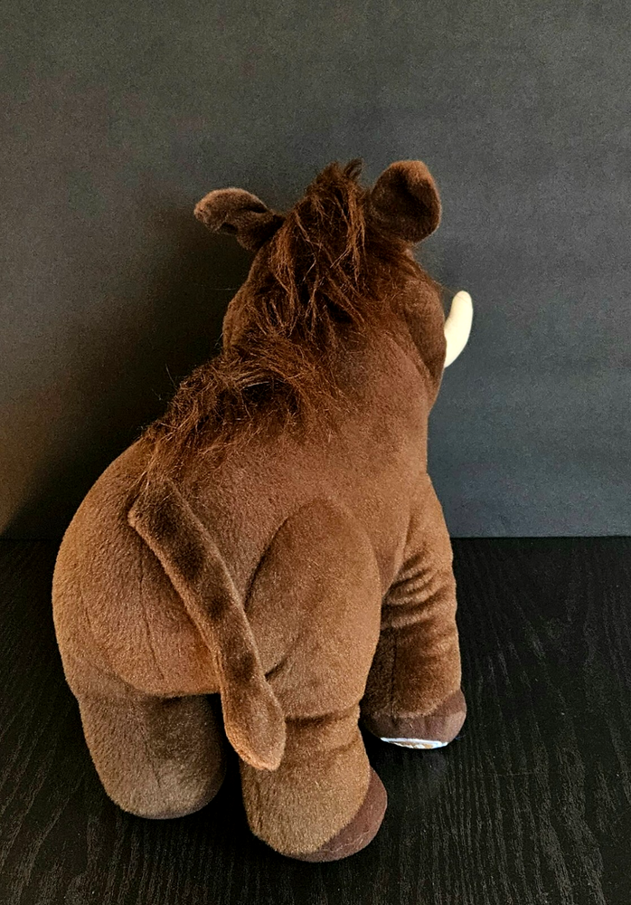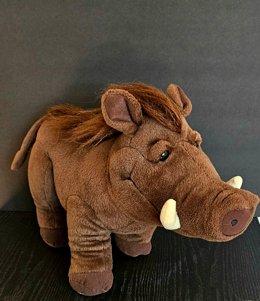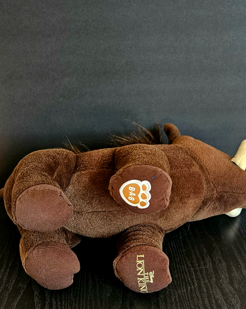 The product is a 16" plush stuffed animal of Pumba from the Disney movie "The Lion King." Manufactured by Build-A-Bear Workshop in 2019, this brown-colored bear is part of the franchise's collection and features the character of Pumba with brown eyes. As a single unit, this stuffed animal is perfect for all occasions and is a retired piece from the 2010-2019 time period. Made of plush material, this Build-A-Bear Workshop creation is an original piece and a must-have for fans of the beloved movie.