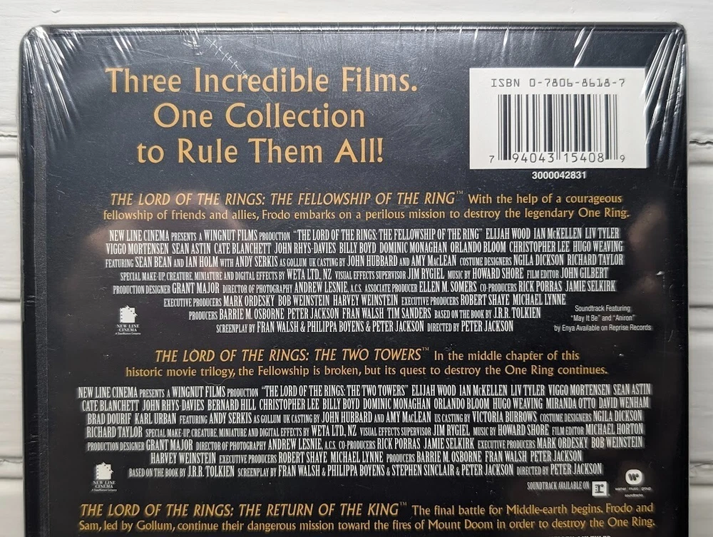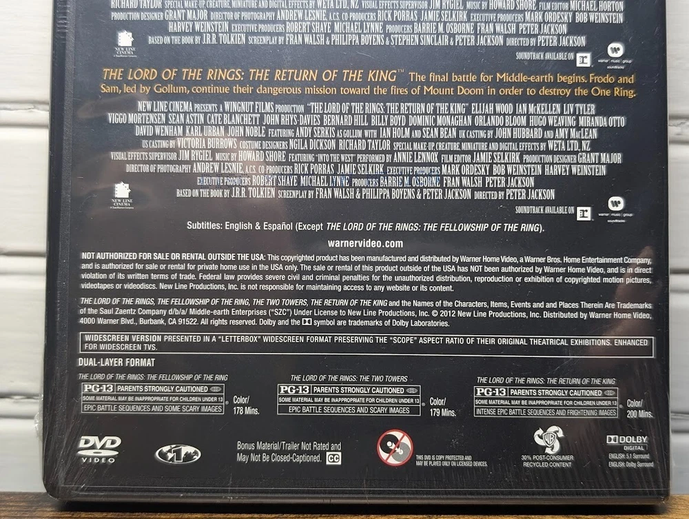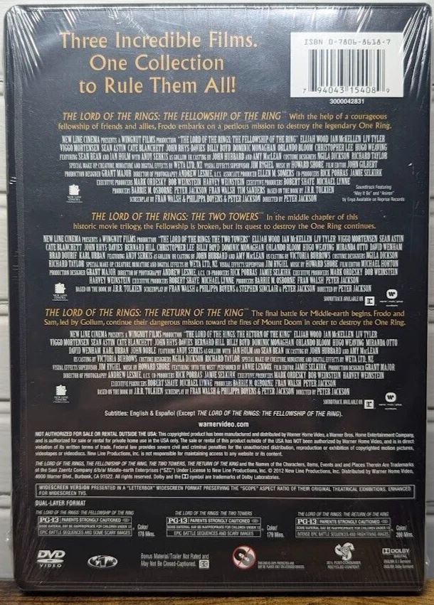 Director: Peter Jackson Language: English Studio: Newline Features: Widescreen, With Subtitles gtin13: 0794043154089 Movie/TV Title: Lord of the Rings: 3-Film Collection Case Type: Tall/DVD Case Franchise: The Lord of the Rings Rating: PG-13 UPC: 0794043154089 Release Year: 2014 Format: DVD Edition: Theatrical Versions Country/Region of Manufacture: United States Genre: Sci-Fi & Fantasy Region Code: DVD: 1 (US, Canada...) Actor: Elijah Wood, Ian McKellen, Viggo Mortensen Type: Movie Video Format: NTSC