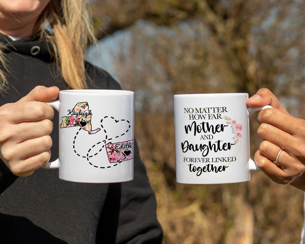 The Love Between Mother And Daughter Personalized Long Distance Mug Moving Away Product Details.. This high quality 11oz. ceramic white mug has a premium hard coat that provides crisp and vibrant color reproduction sure to last for years. Perfect for all hot & cold beverages. The highest quality printing possible is used. It will never fade no matter how many times you wash it. Material: 100% Ceramic. Print both sides. Dishwasher and Microwave Safe. High Gloss + Premium White Finish. Printed in the U.S.A. Personalized & Custom. We support personalized and custom mug to add custom, when placing an order, you can add notes to the "order note" in shipping address section. Also you can contact us directly via message. Shipping Info. Ready to ship in 1 to 2 business days, All products are made-to-order and proudly printed in the United States. Shipped by USPS and DHL, You will receive your order in 5-7 days. Replace & Refund. All products are defective during shipping broken, chipped will be replaced free of charge. You are not satisfied with the product, we will refund 100% money to you. If any other issues arise, please do not hesitate to message, we would be more than happy to assist you.