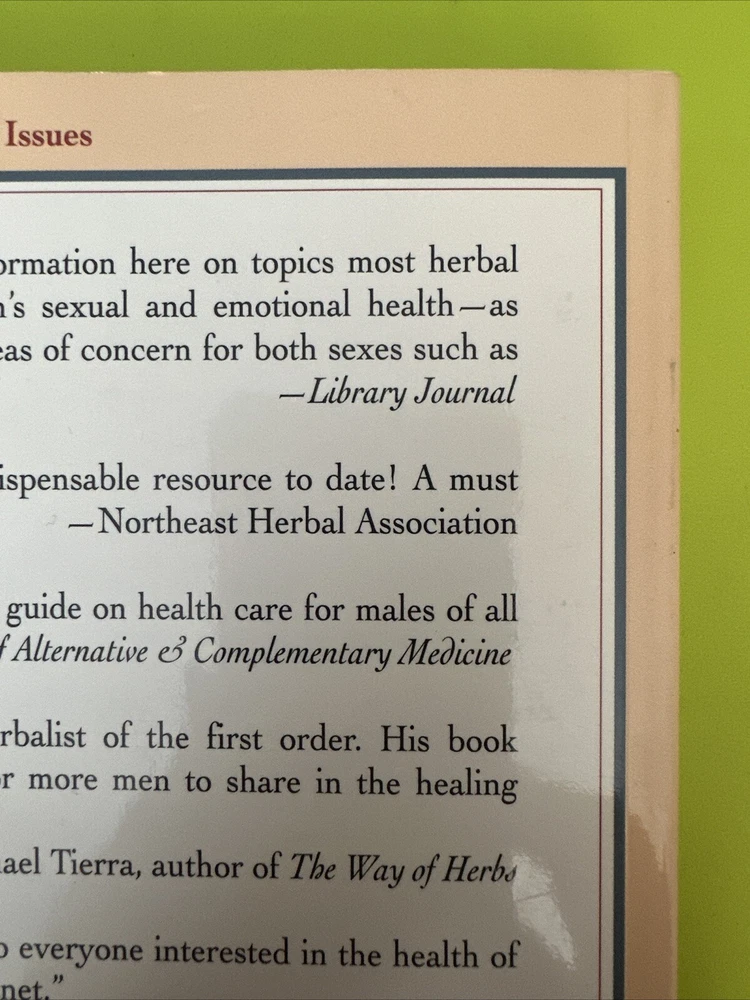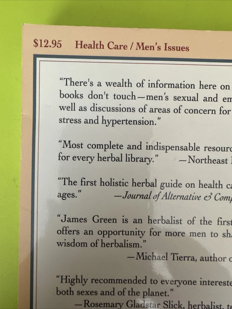 This hardcover book, titled "Male Herbal: Health Care for Men and Boys" by James Green, is a comprehensive guide to alternative therapies, men's health, and herbal medications. Published by Ten Speed Press in 1991, this book covers 278 pages of detailed information on the topic. The book measures 9 inches in length and 6 inches in width, weighing 20 oz. It is written in English and illustrated by the author. The genre of the book is health and fitness, making it a valuable resource for those interested in the topic.