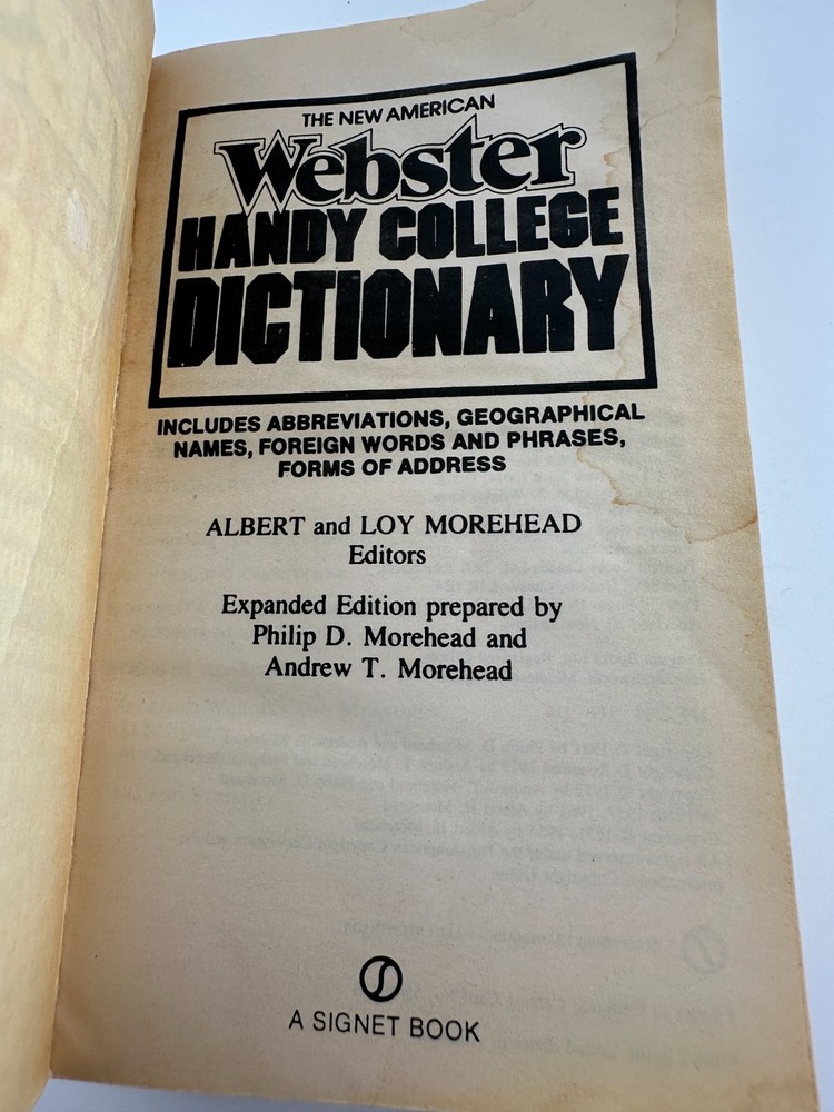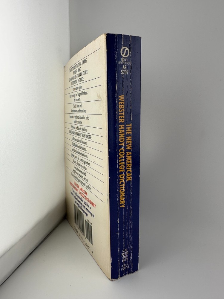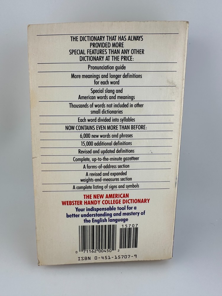 1981 vintage paperback edition of The New American Webster Handy College Dictionary. Revised and expanded reference with pronunciations, slang, abbreviations, and over 115,000 definitions—great for collectors, writers, or students.