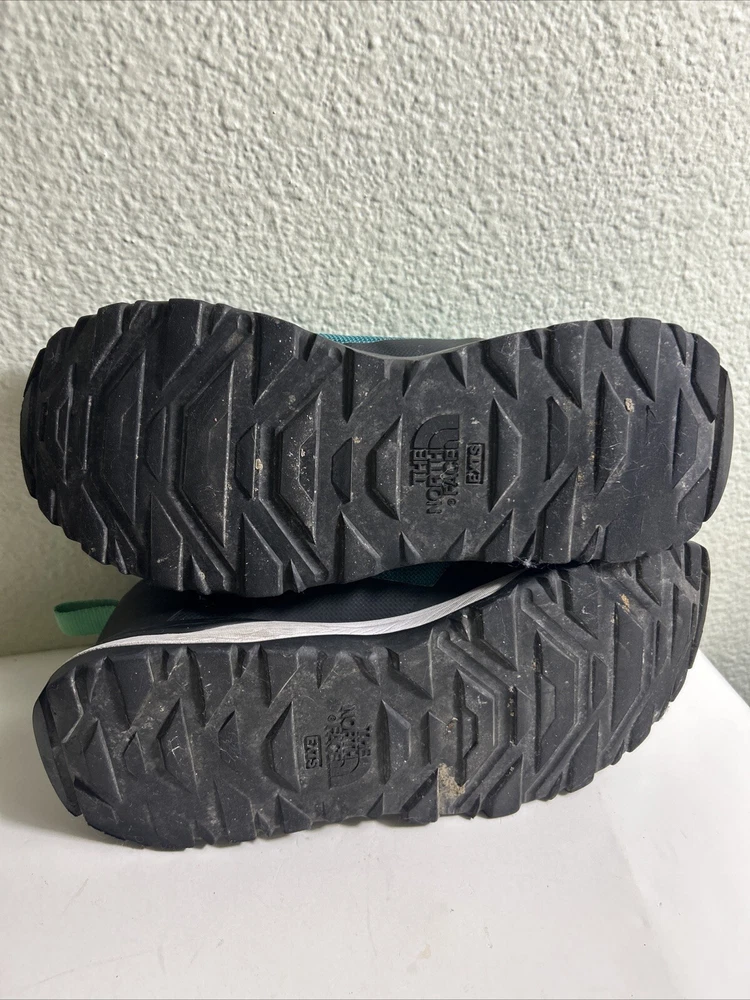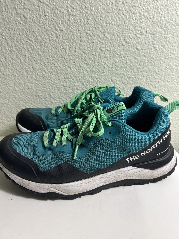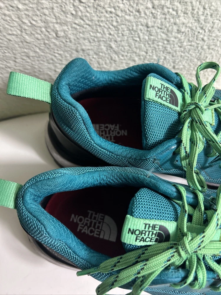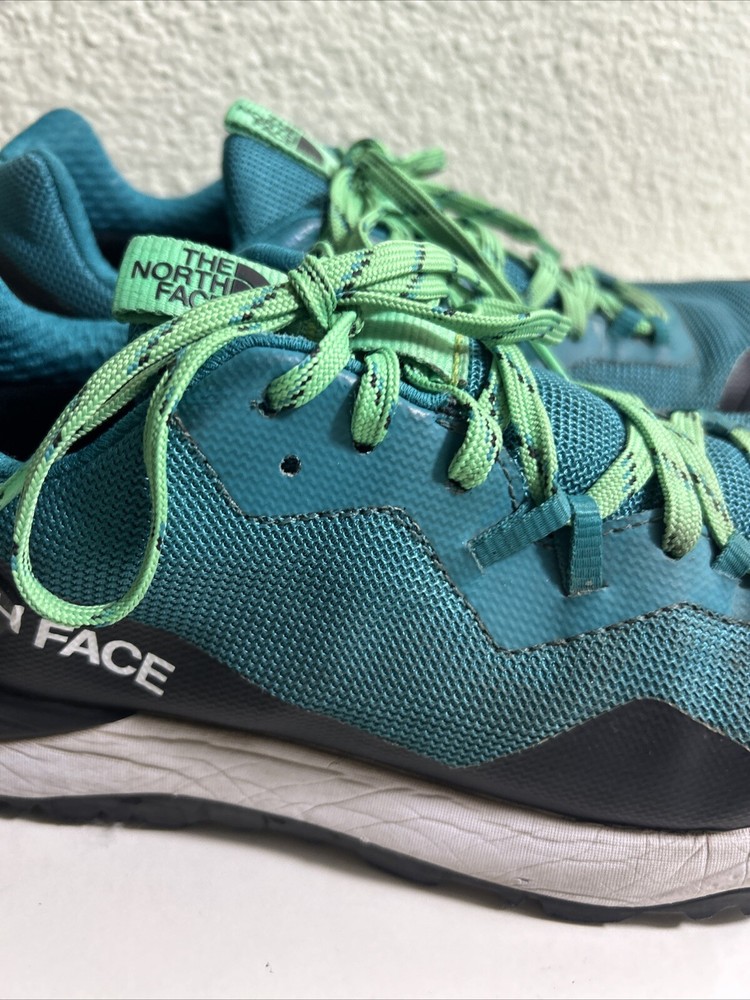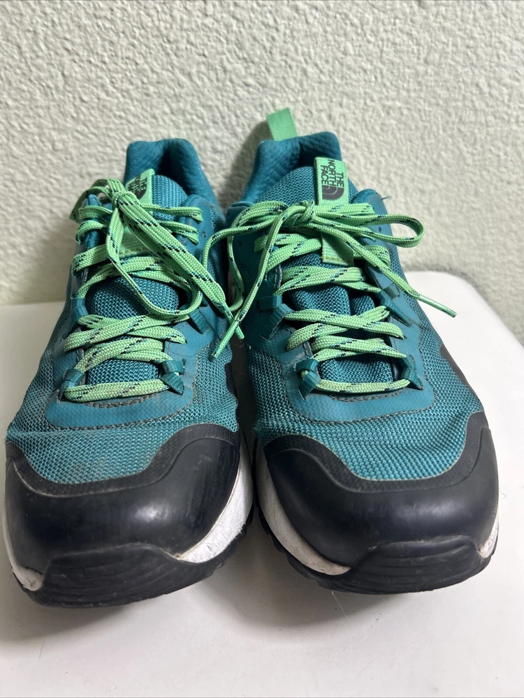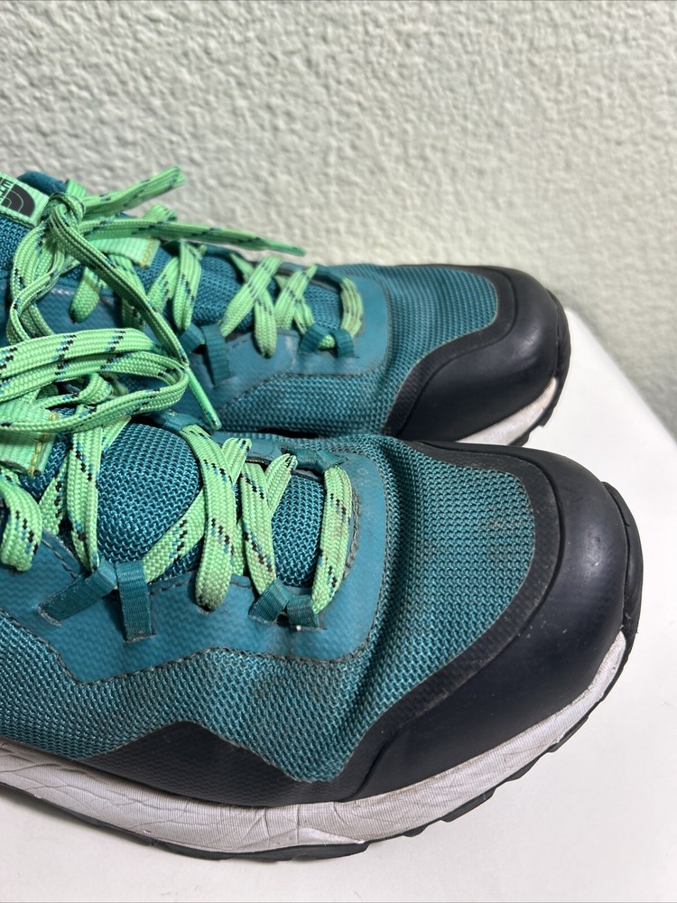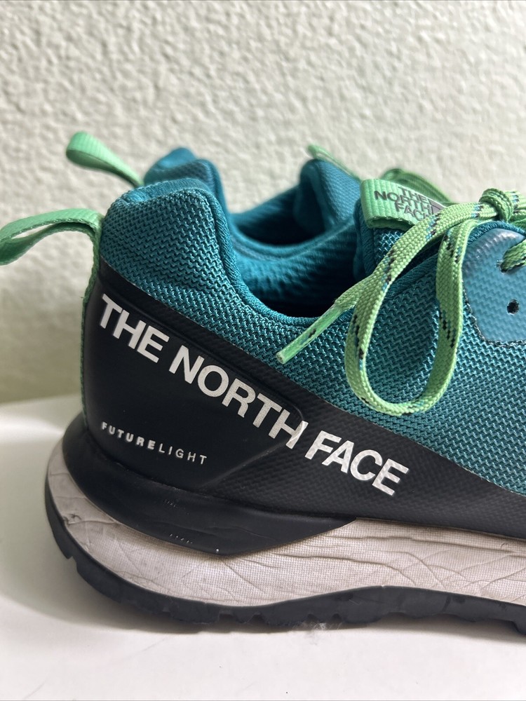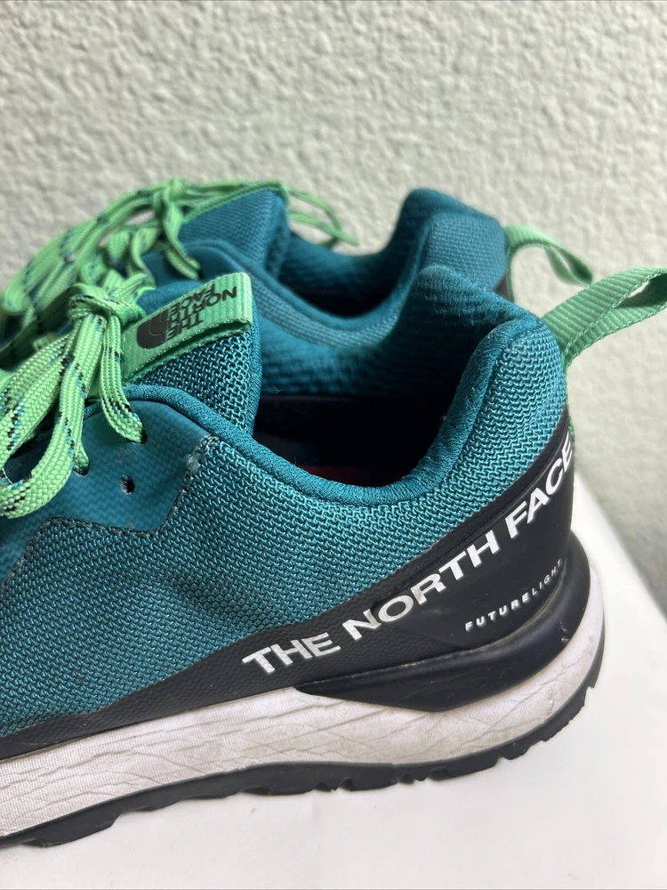 The North Face Activist Futurelight Hiking Sneakers in teal, size 9, feature a low top shoe shaft style with lace-up closure. These athletic shoes are designed for outdoor activities like hiking in the summer, fall, and spring seasons. Made with performance mesh upper material, they are part of The North Face Vectiv product line, perfect for activewear and casual wear.