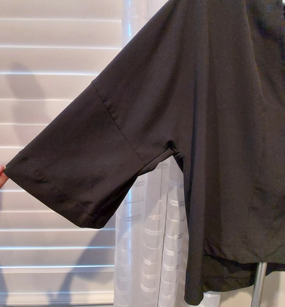 This black blouse from The North Face features a deep V-neckline and 3/4 bell sleeves, making it a perfect addition to your casual wardrobe. The inside tag is missing, so I'm unsure of what fabric it is made of, but it is lightweight and stretchy. With a classic fit and a solid pattern, this blouse is a versatile piece that can be dressed up or down. The pullover closure and kimono style add to its effortless design. Made in Haiti, this blouse is available in size medium and is perfect for women who appreciate quality clothing.