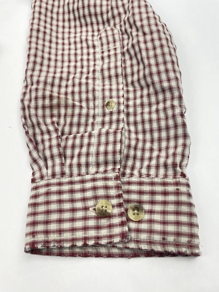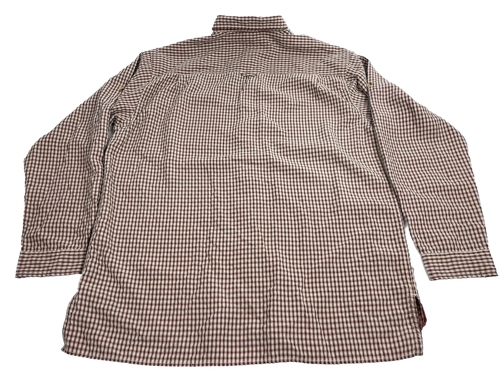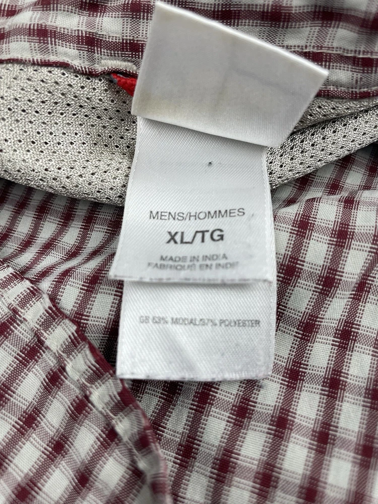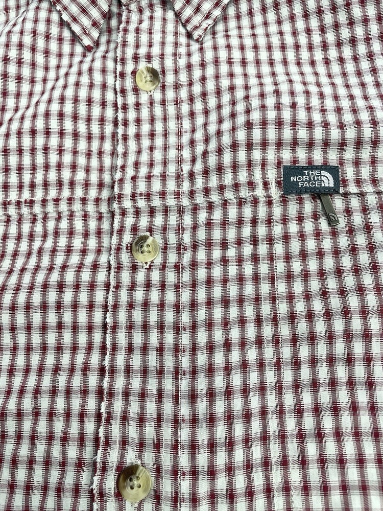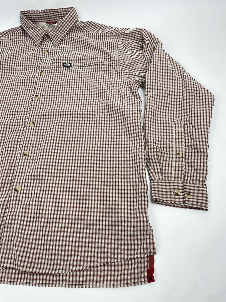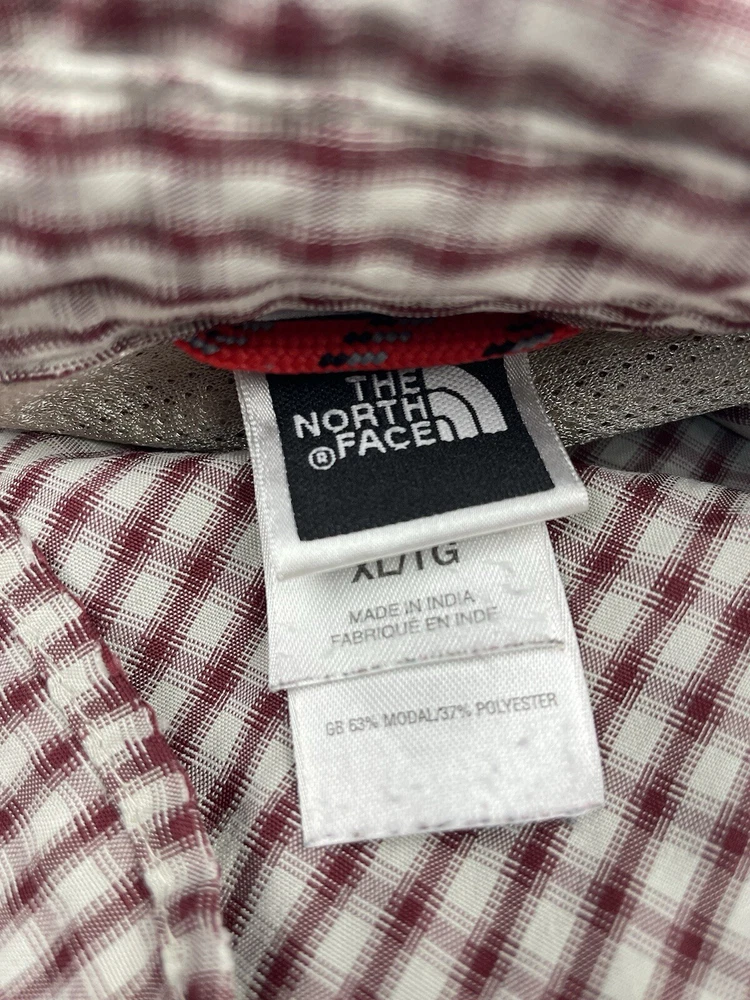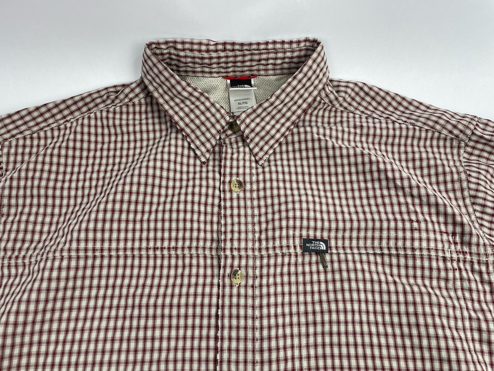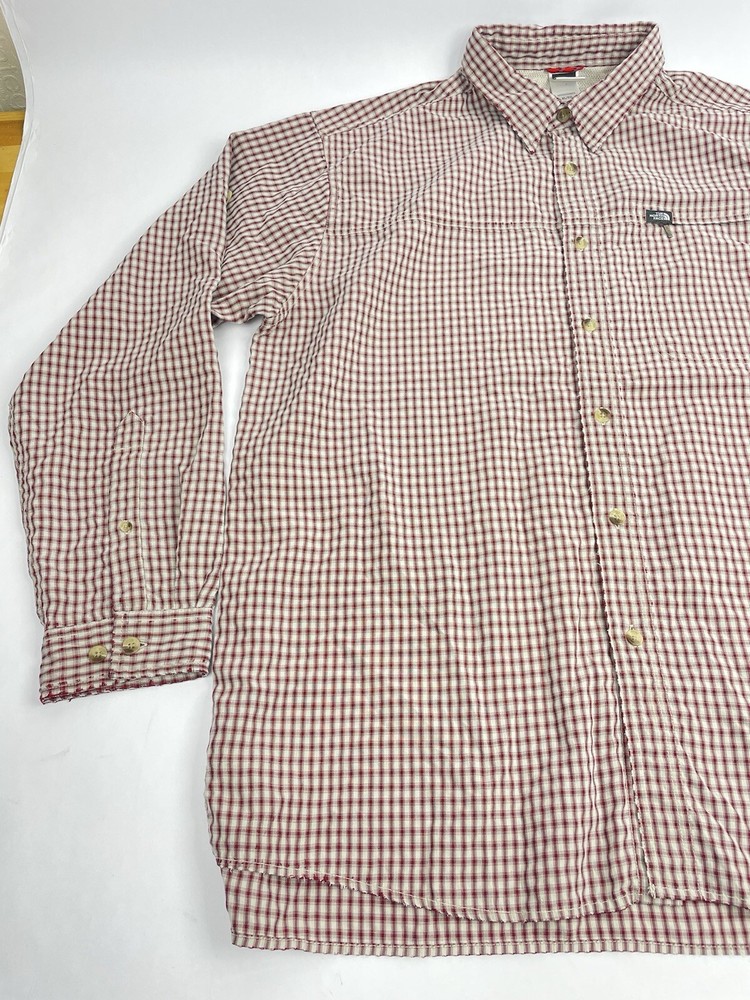 The North Face Shirt Mens Sz XL Red Plaid Outdoor Button Up Long Sleeve. In nice preowned condition. No holes. Faint stain on left cuff. See pictures. Distressed look. Armpit to armpit flat lay 25 inches Shoulder to shoulder 21 inches Top shoulder to bottom front hem 32 inches Armpit to cuff end 21.5 inches Flyp I35