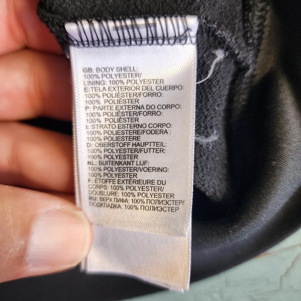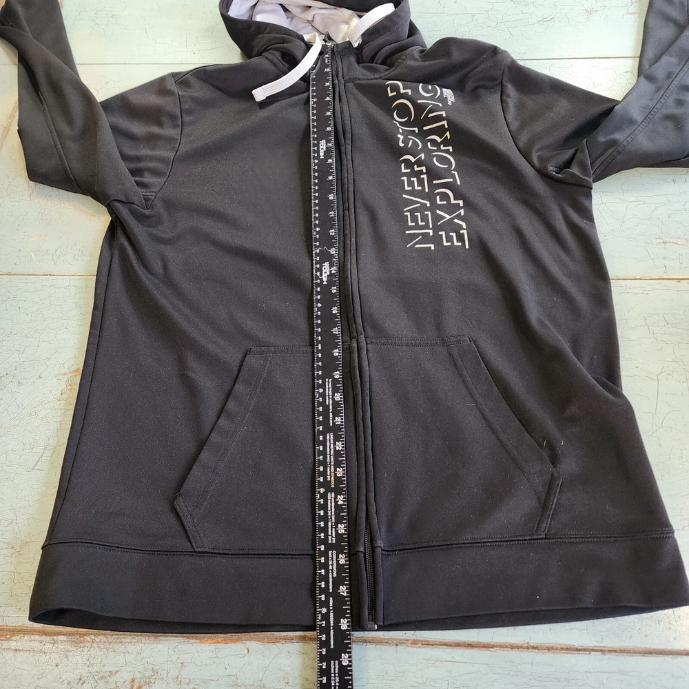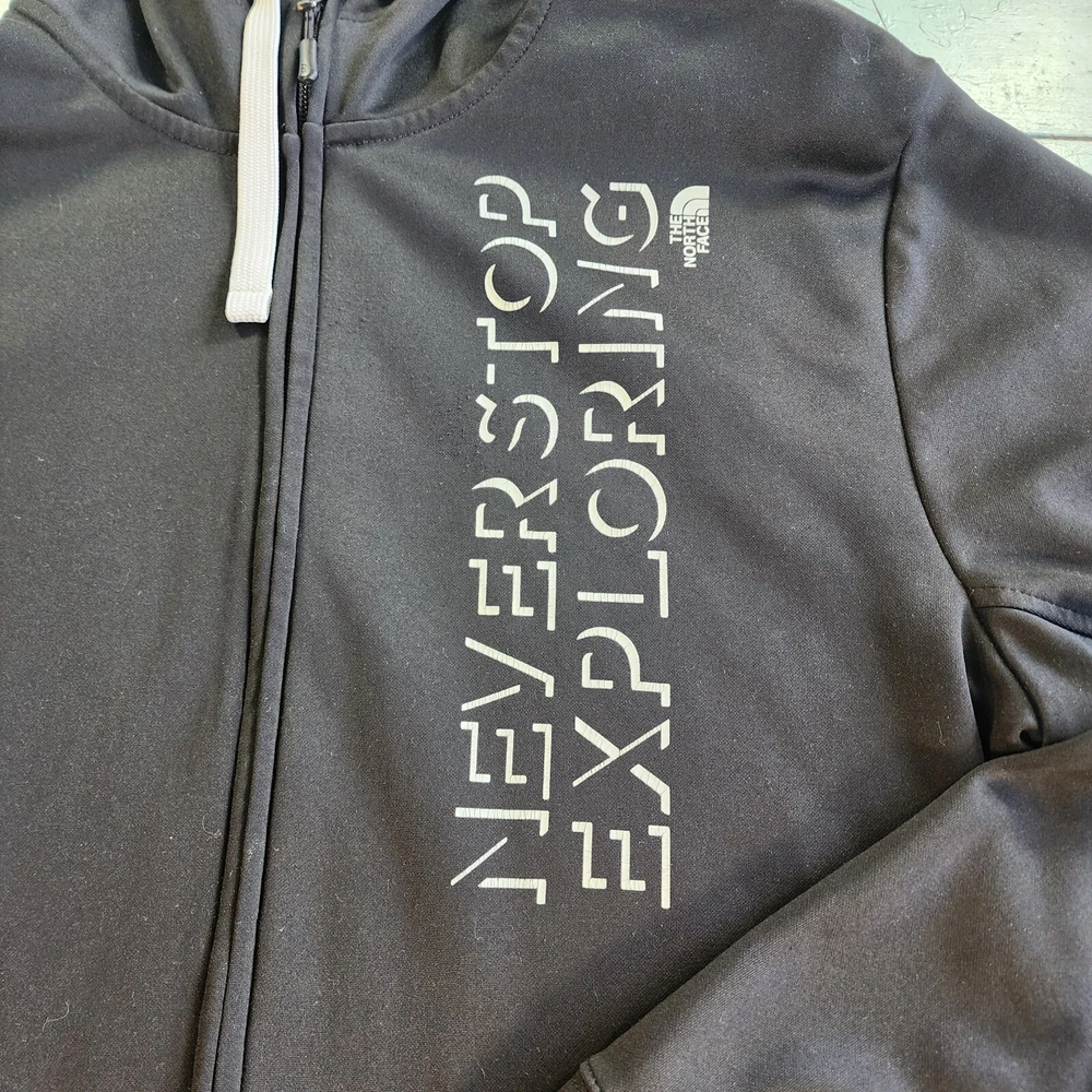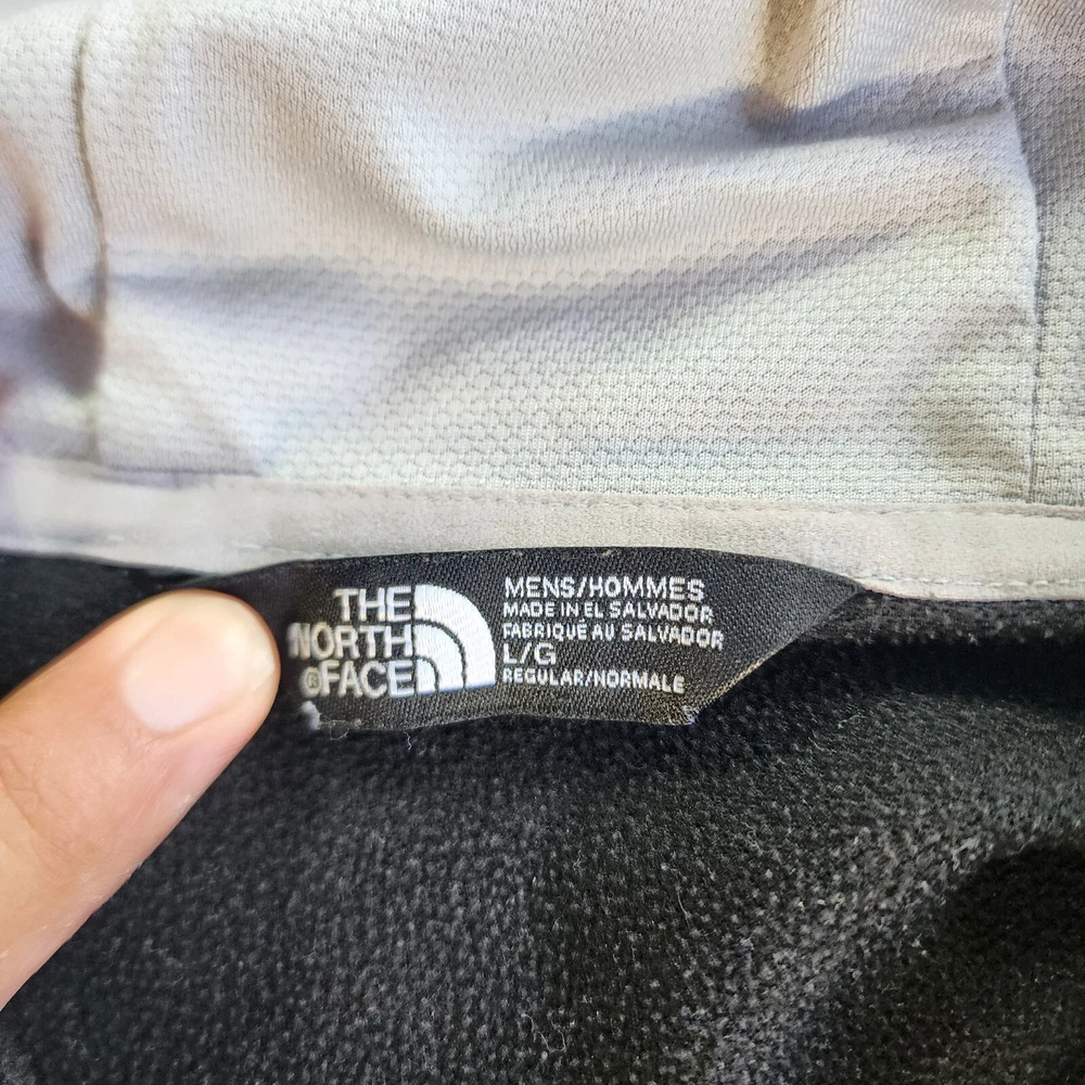 This black North Face jacket for men is a versatile piece suitable for different occasions. It features a long sleeve and a full zip closure, with a hood to keep you warm and protected in different weather conditions. The jacket is made of polyester and has a fleece fabric type, with a solid pattern and black color. The jacket also has different accents, including a zipper and the North Face logo, and comes with pockets to keep your essentials close. It's a great choice for outdoor activities like hiking, skiing, and walking, and is available in size L. Please note that this item has a minor flaw, but it doesn't affect its functionality.