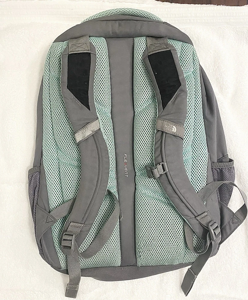 The North Face Jester FLEXUENT Grey/Aqua Backpack is a versatile and durable for hiking, camping or school. Good pre owned Condition. (C-12)