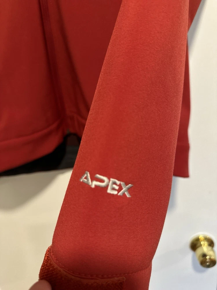 The North Face Mens Medium Apex Bionic Softshell Deep Red Full Zip Jacket. Hand warmer zip pockets. Single zip Chest pocket. Adjustable cuffs. Drawstring waist. Excellent used condition. No rips, stains or defects. Please see pictures for measurements.