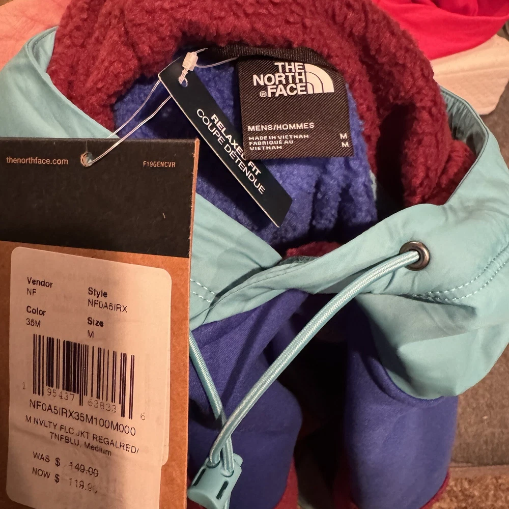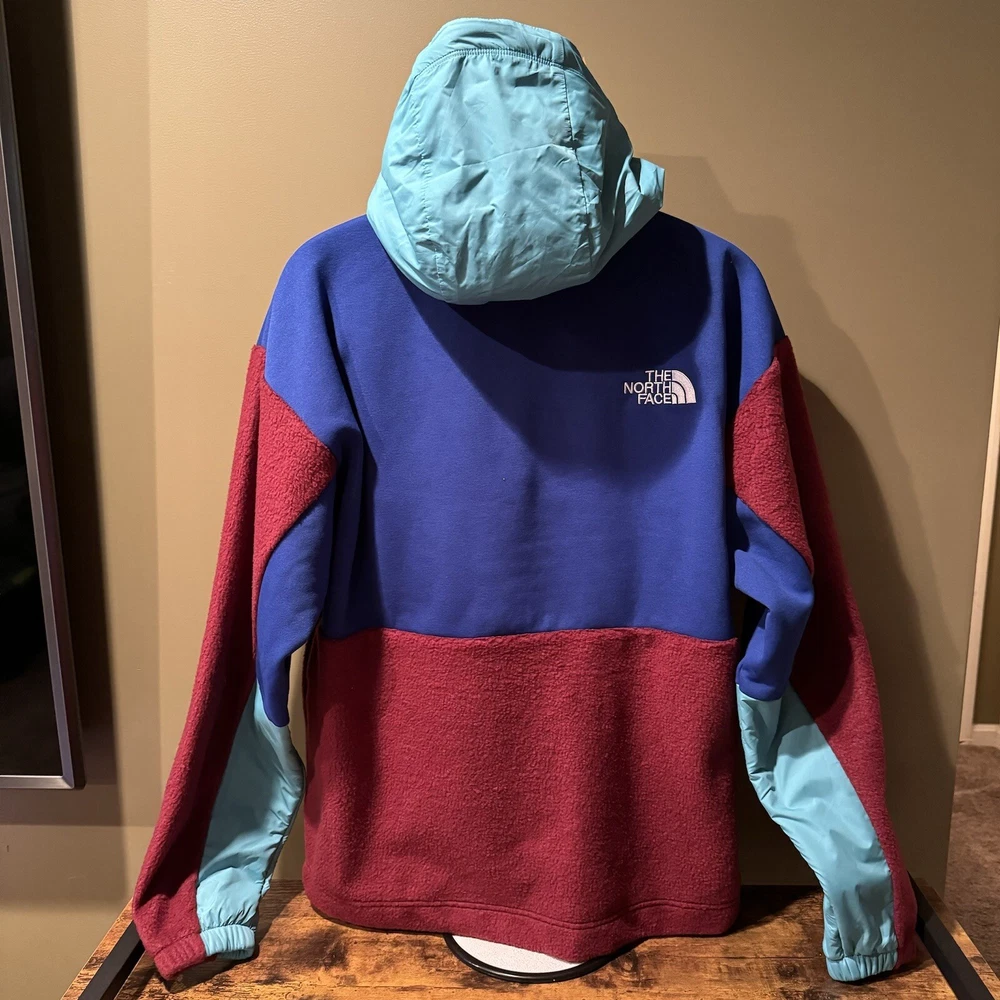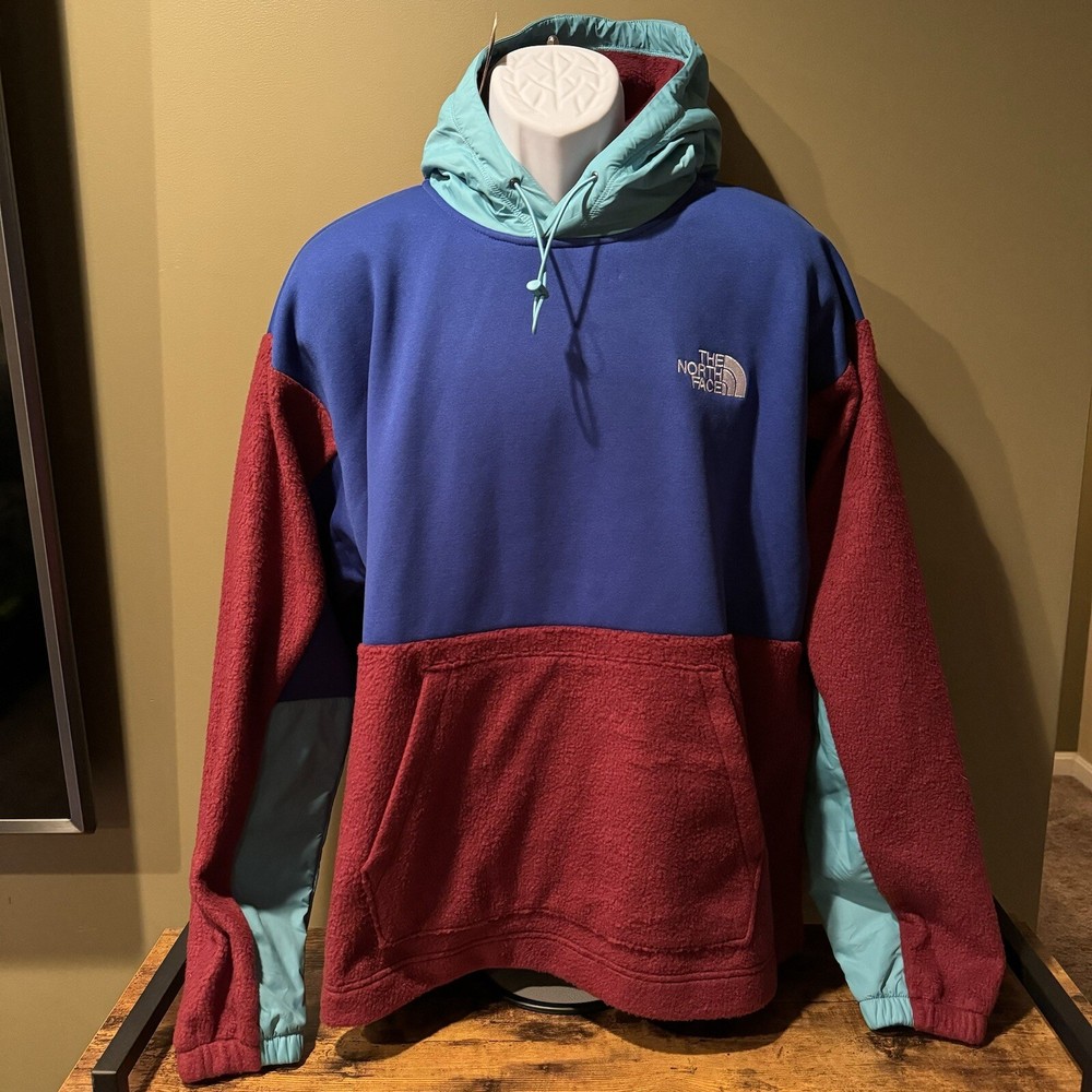 Introducing THE NORTH FACE Men's Relaxed Fit Pullover Hoodie Jacket in Regal Red/TNF Blue, size M. This stylish jacket is perfect for casual wear, walking, hiking and other outdoor activities. Designed with a polyester outer shell material, this fleece jacket comes with new tags and is sure to keep you warm and comfortable. The jacket is made by The North Face, a reputable brand in the clothing industry. It features a relaxed fit and is suitable for men of all sizes. The jacket comes in a trendy multicolor design that is perfect for any occasion. Get your hands on this amazing jacket today and elevate your outdoor wardrobe.