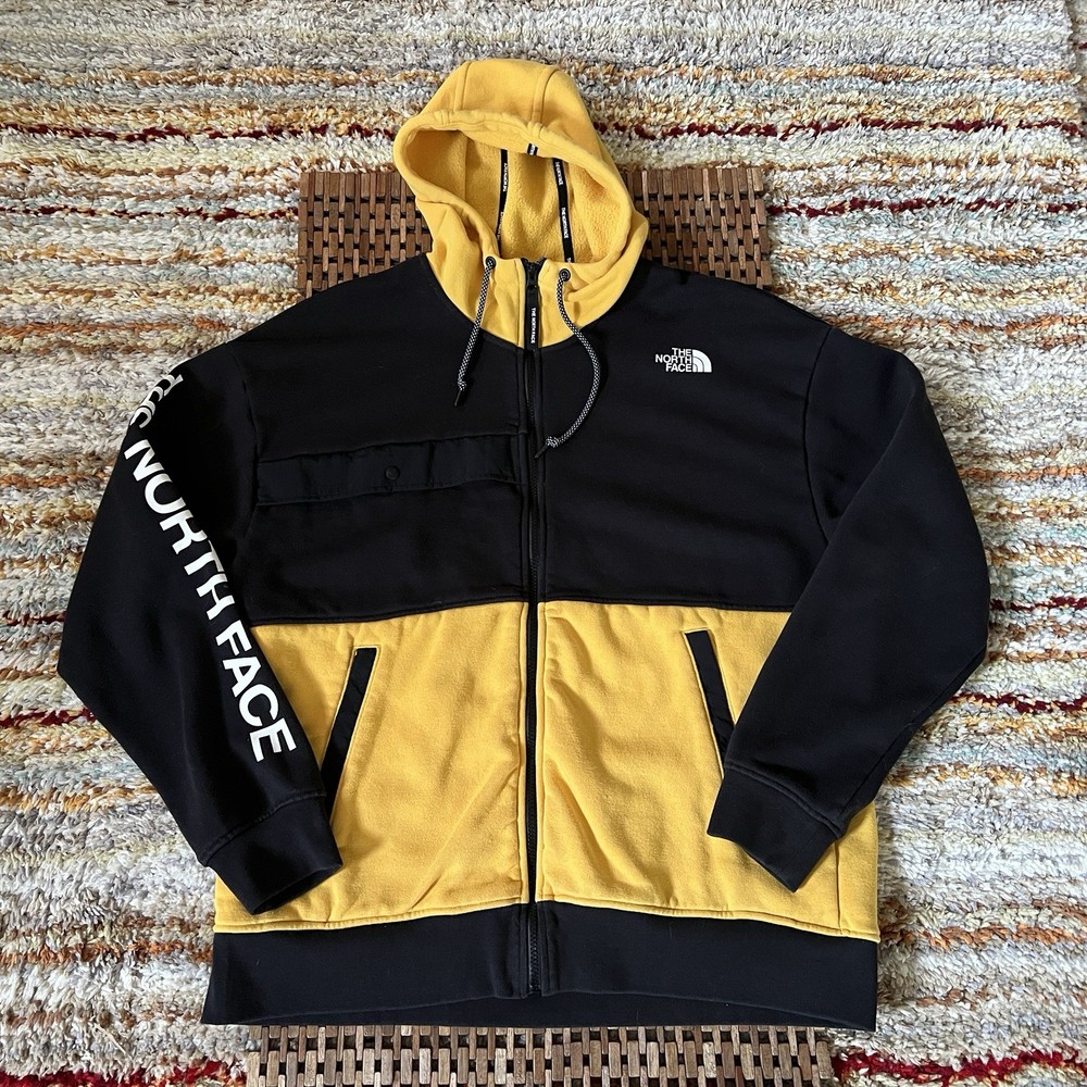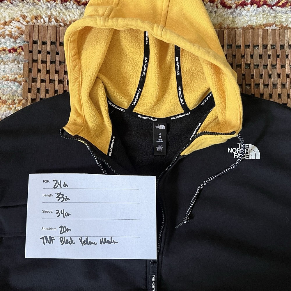 The North Face Men's Tech Fleece Sherpa Hoodie Hoody Jacket in Black with Yellow accents is a stylish and practical outerwear piece for men. This full zip hoodie features a hood and long sleeves, making it perfect for outdoor activities. The fleece fabric provides warmth and comfort, while the logo accents add a touch of style. In size Medium, this hoodie combines functionality with a trendy outdoor theme, ideal for casual wear or outdoor adventures.