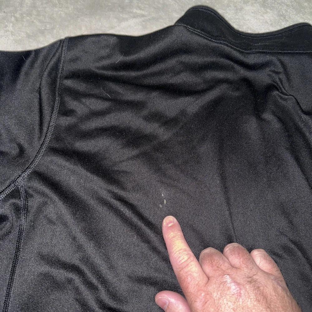 Small spot on the back. See pics. This black sweatshirt from The North Face is a must-have for any outdoor activity. With a solid pattern and embroidered logo accents, it features a collared neckline and long sleeves with a 1/4 zip closure. Made from soft fleece fabric, it is comfortable and machine washable for easy care. This sweatshirt is designed for men in size XL with a regular fit and is perfect for walking in the winter, fall, or spring seasons. It is a pullover style with no graphic print and is not vintage or personalized. Made in Nicaragua, this sweatshirt is ideal for any outdoor enthusiast who wants to stay warm and stylish.