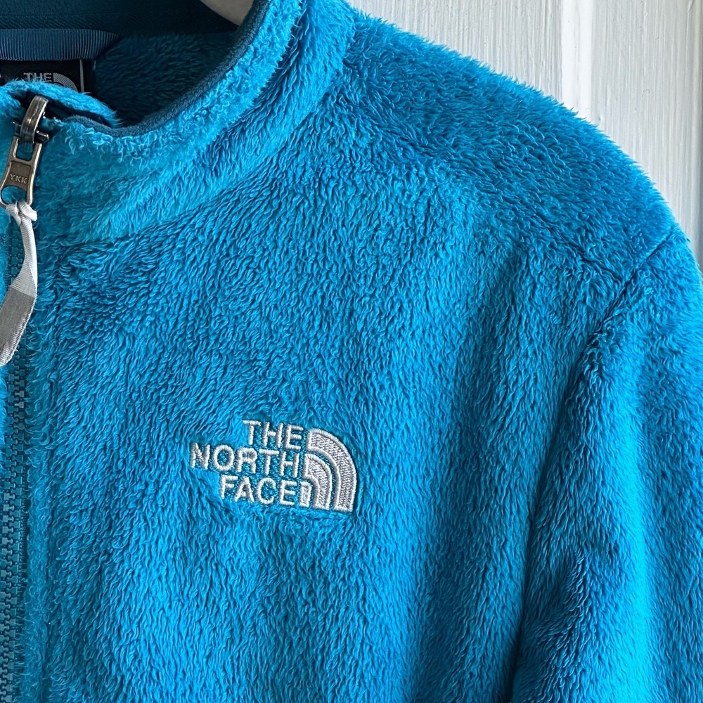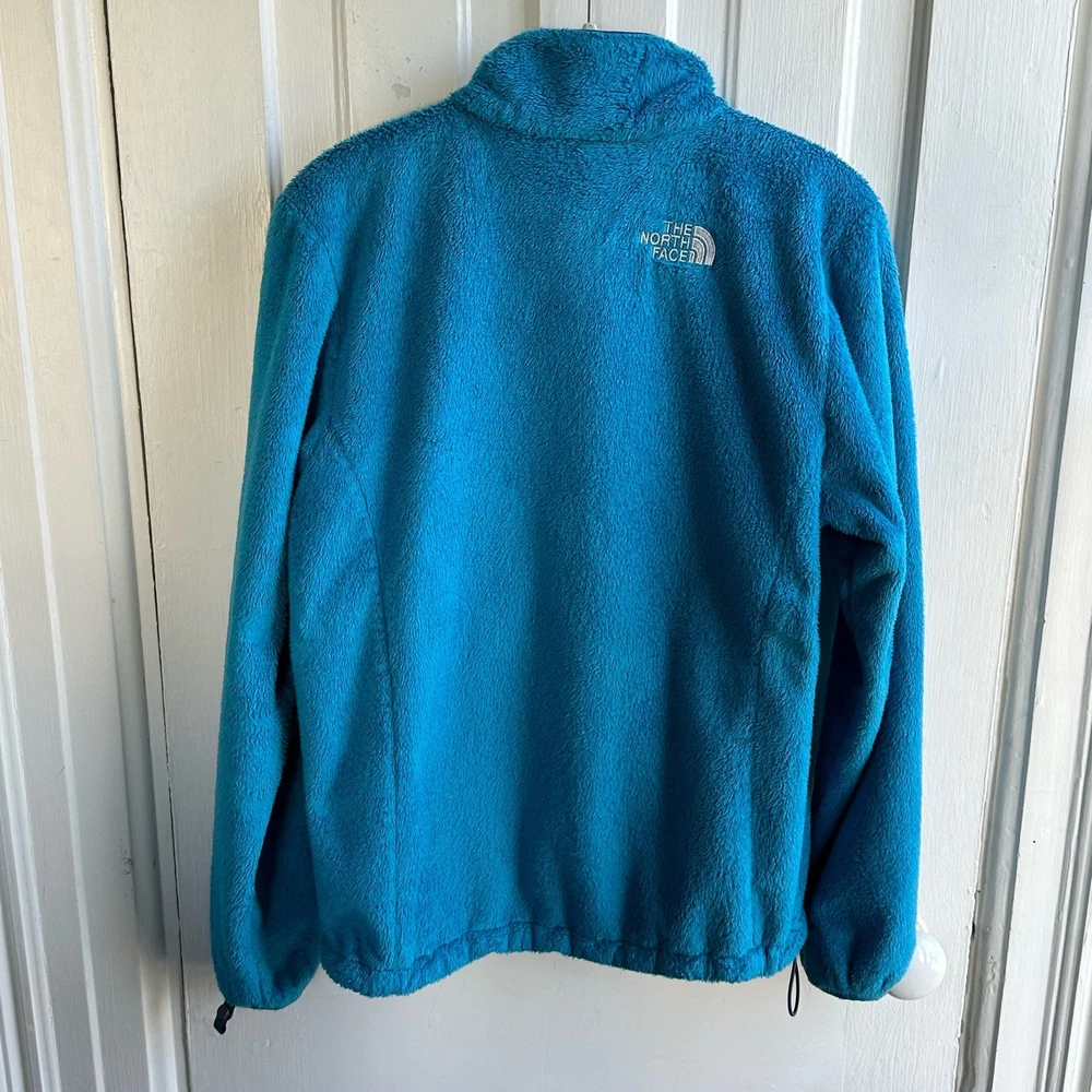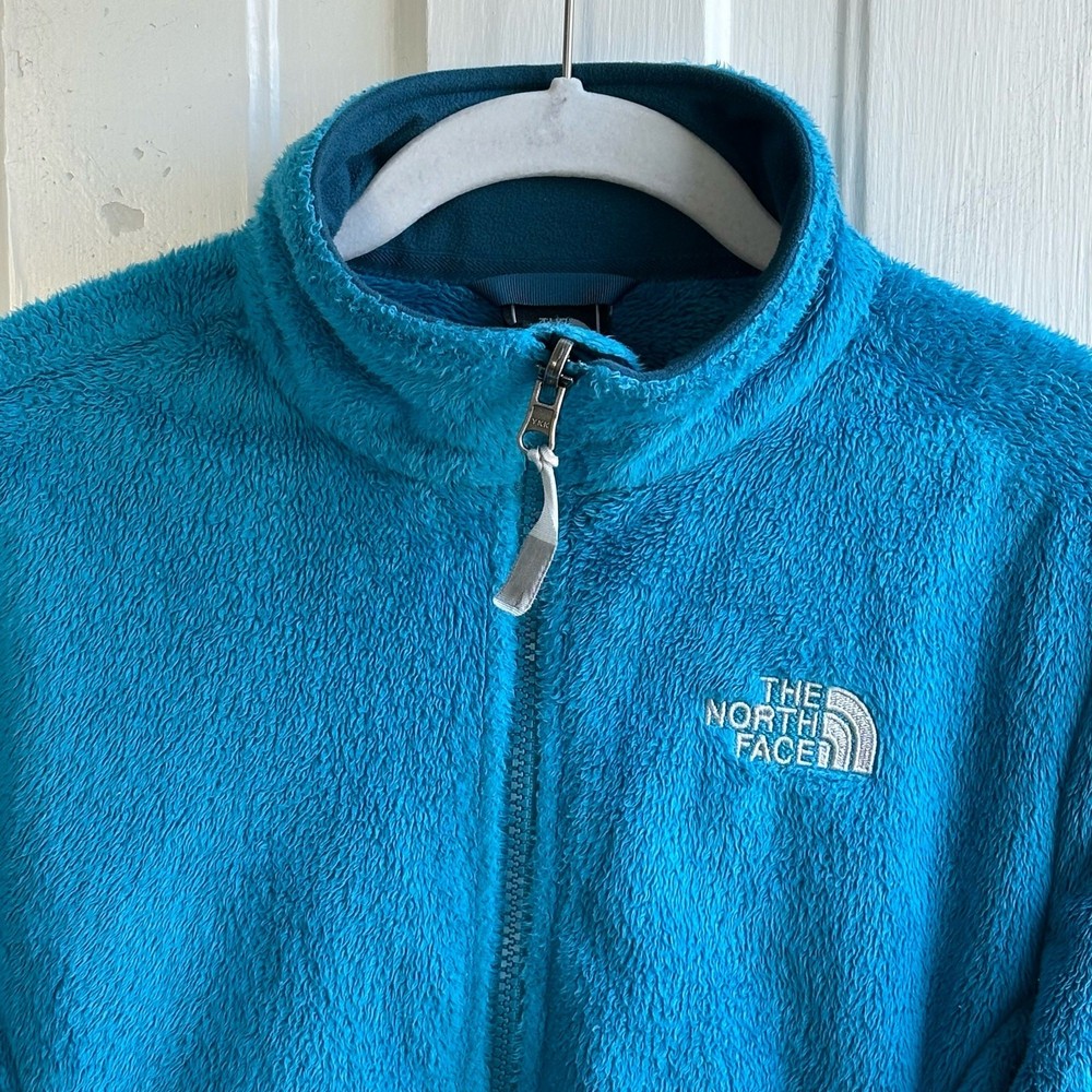 The North Face Osito Fleece Jacket in Teal Blue Size: Small Details: Teal blue High pile fleece Long sleeves Standard fit Full zip front closure Front handwarmer pockets with zipper closure Elastic cuffs Cinch waistband Silver embroidered logo on chest and back shoulder Approx. measurements: Armpit to armpit = 19" Shoulder to hem = 24" Excellent pre-owned condition