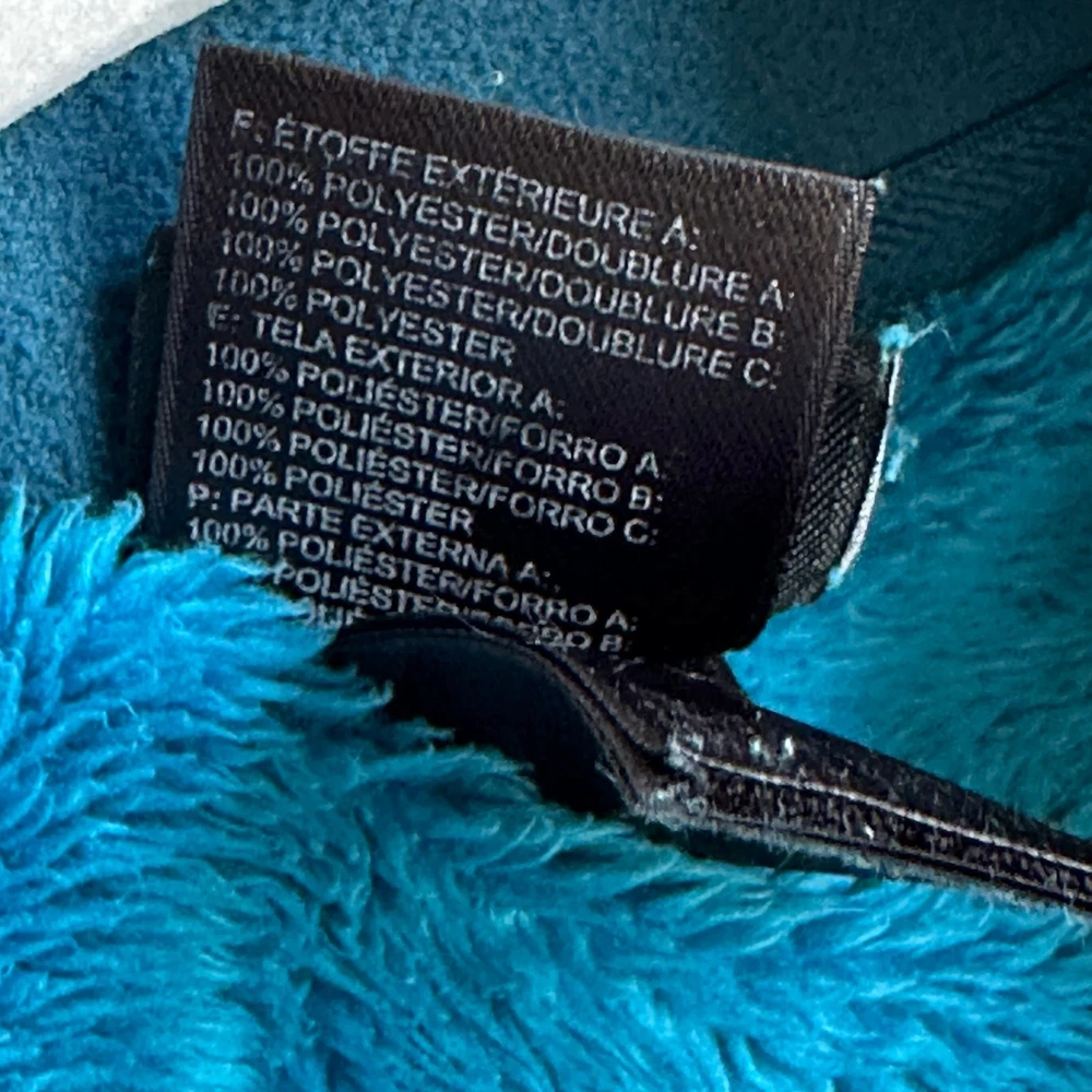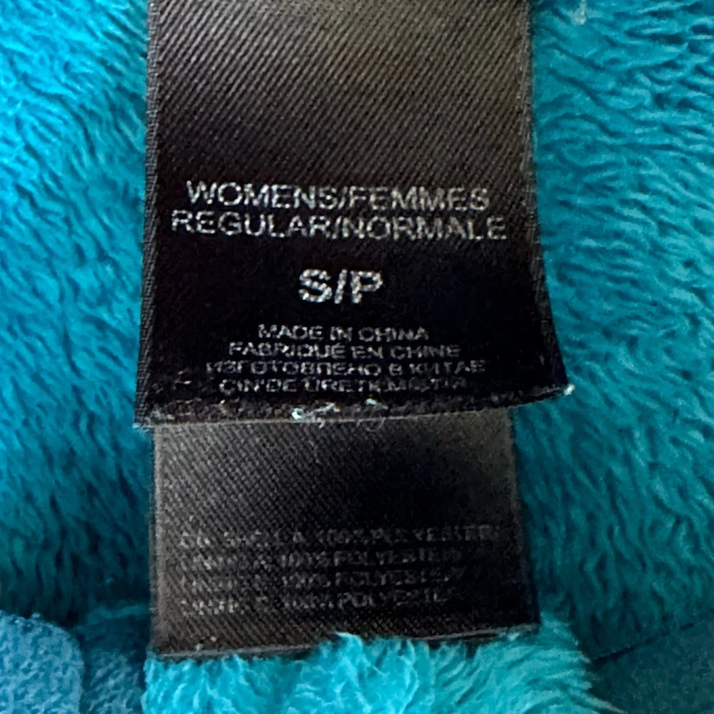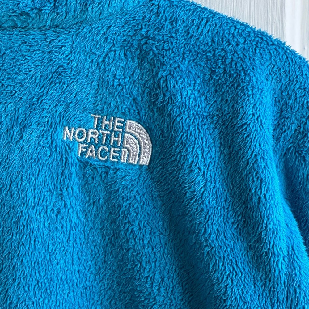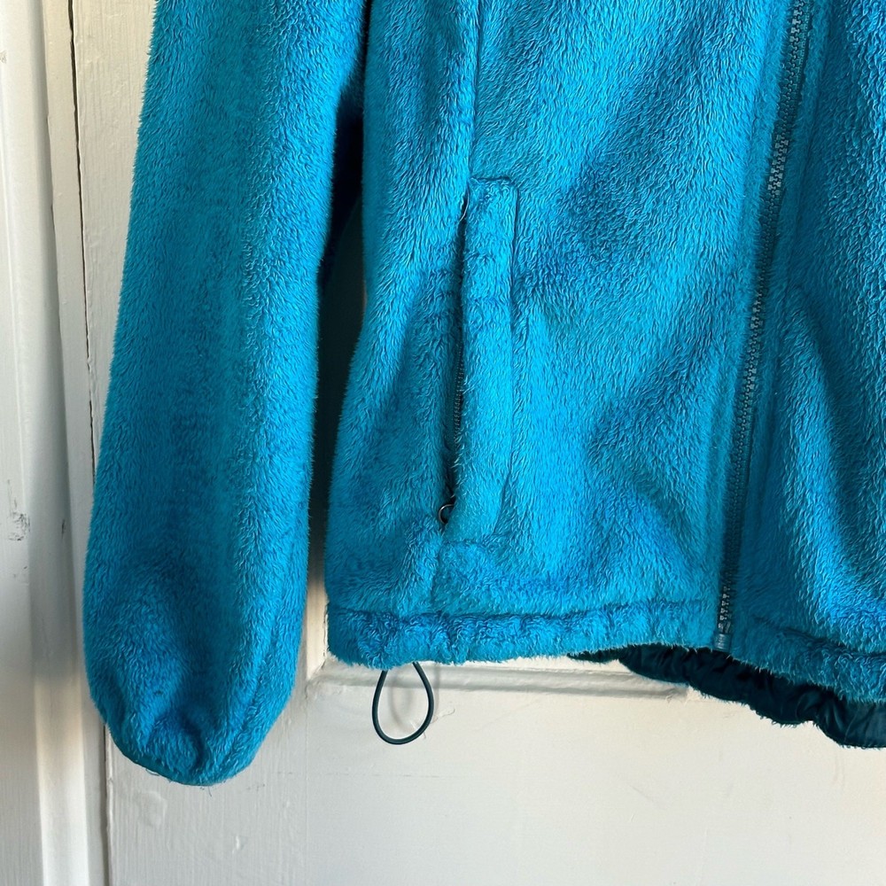The North Face Osito Fleece Jacket in Teal Blue Size: Small Details: Teal blue High pile fleece Long sleeves Standard fit Full zip front closure Front handwarmer pockets with zipper closure Elastic cuffs Cinch waistband Silver embroidered logo on chest and back shoulder Approx. measurements: Armpit to armpit = 19" Shoulder to hem = 24" Excellent pre-owned condition