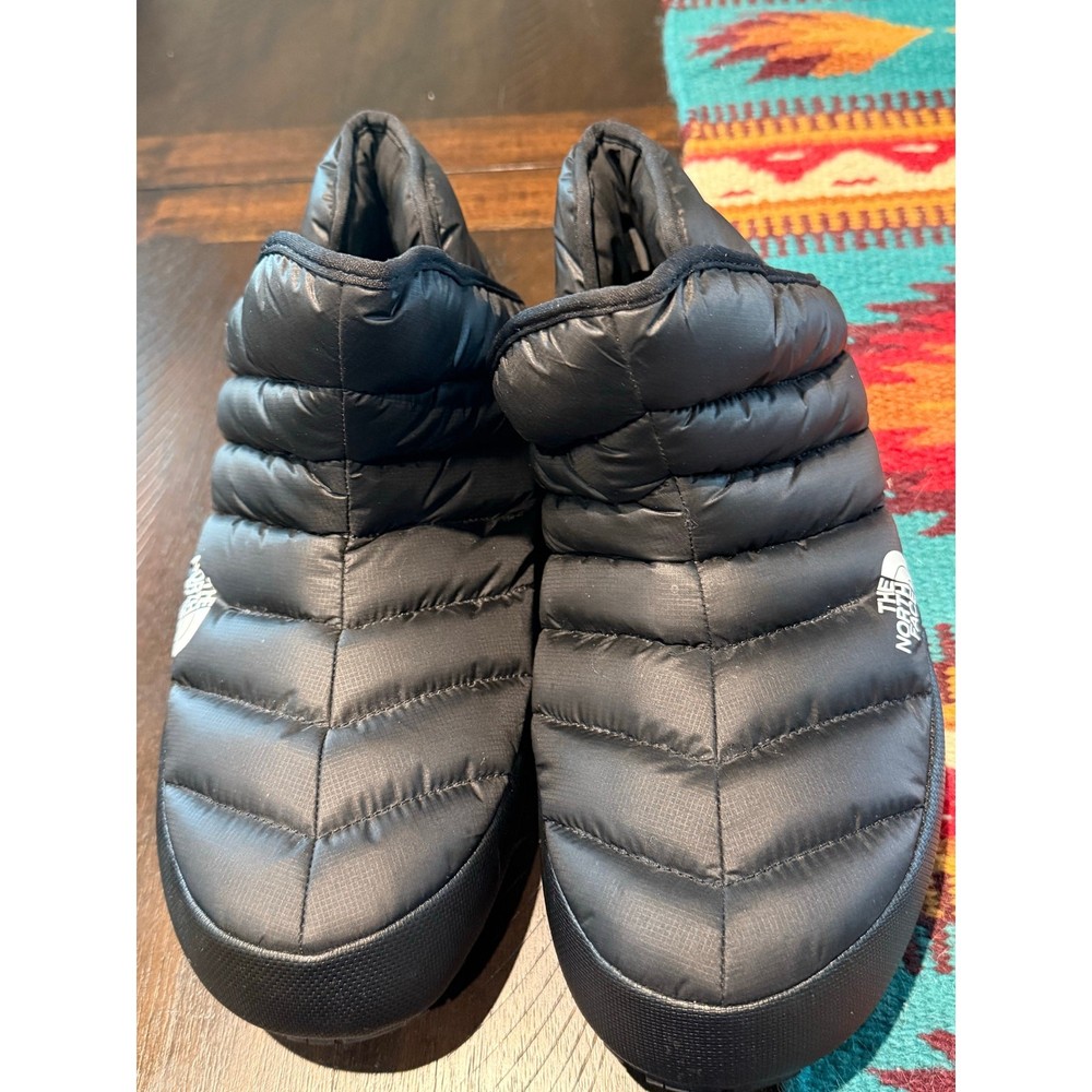 The North Face ThermoBall Insulated Camp Booties Black Men’s 12 / Women’s 13.5 The North Face ThermoBall insulated camp booties, designed for warmth and comfort in cold weather. These lightweight slip-on boots feature ThermoBall™ Eco insulation, which provides reliable warmth even when damp, making them perfect for camping, travel, lounging, or quick trips outside. The quilted nylon upper is soft and packable, while the durable rubber outsole offers traction for indoor and light outdoor use. Easy pull-on design with heel loops for convenience. Details: • Brand: The North Face • Model: ThermoBall™ Camp Booties • Insulation: ThermoBall™ Eco • Color: Black • Slip-on style • Lightweight & packable • Rubber traction outsole • Made in Cambodia Size (per tag): • Men’s US 12 • Women’s US 13.5 • EU 45.5 | CM 30 Excellent pre-owned condition. Light signs of wear from normal use. No rips or holes noted. Soles show light wear only. See photos for details. Perfect for camping, travel, après-ski, or cozy everyday wear.