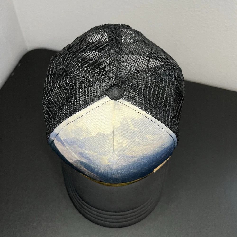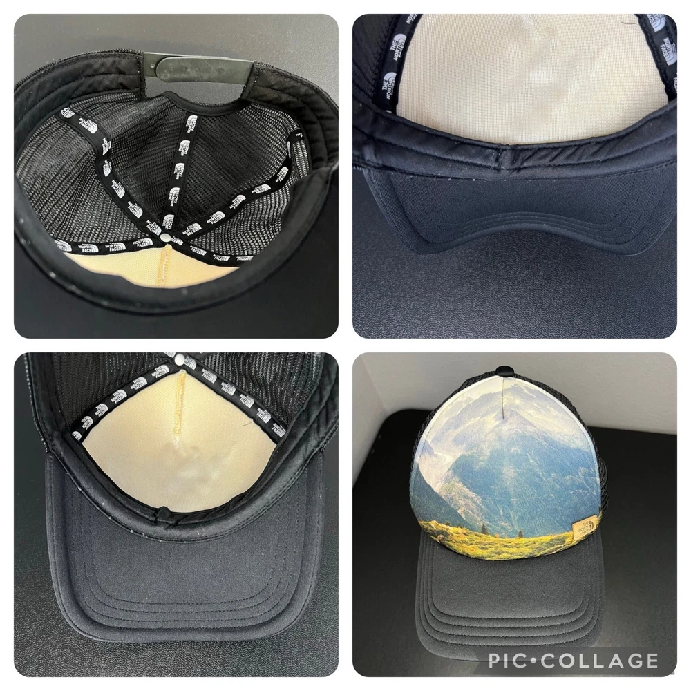 The North Face mountain scene trucker snapback hat, in good pre-owned condition. Please see the photos for more details on the item and condition.