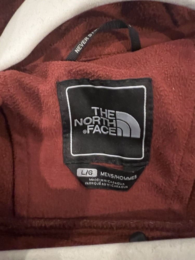 The North Face Apex Bionic Jacket in burgundy, size L for men is a windbreaker made of polyester with a softshell fabric type. It features a zip closure, polyester lining, and logo accents. Excellent used condition. No rips, tears or holes. Comes from a smoke free and dog free home. Jacket has spent most its life hung up on a closet. Like new.