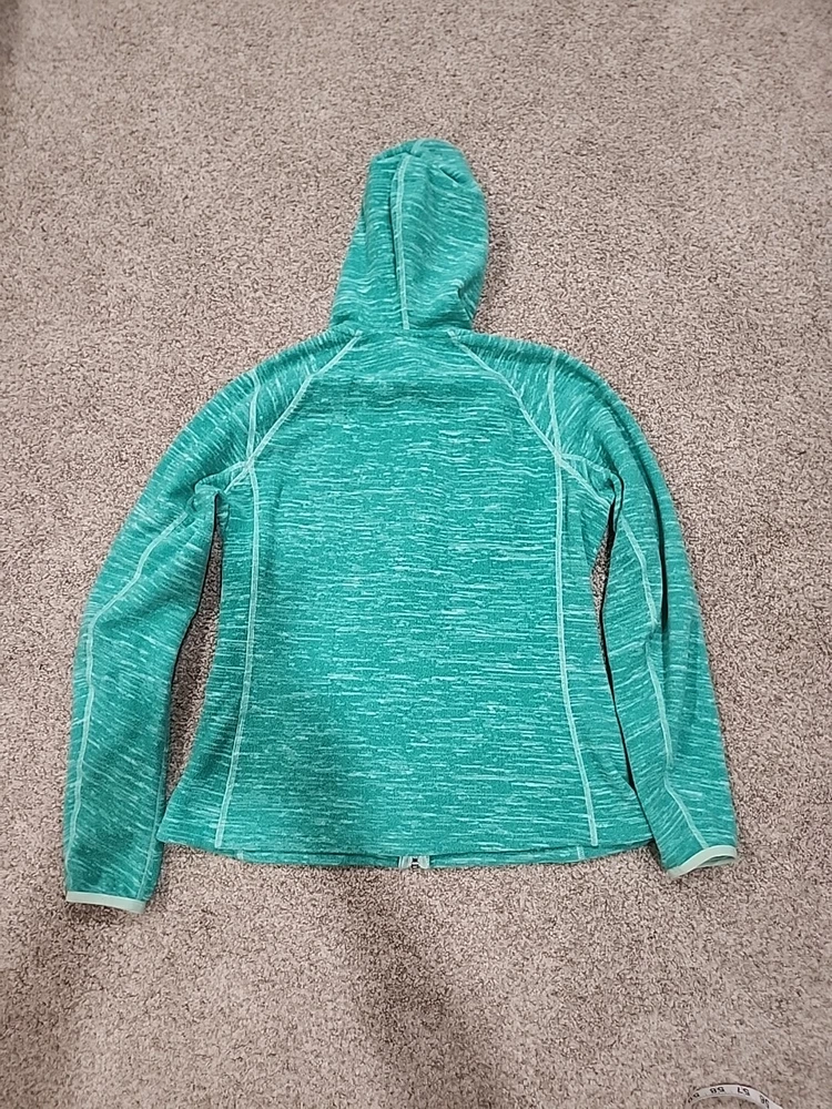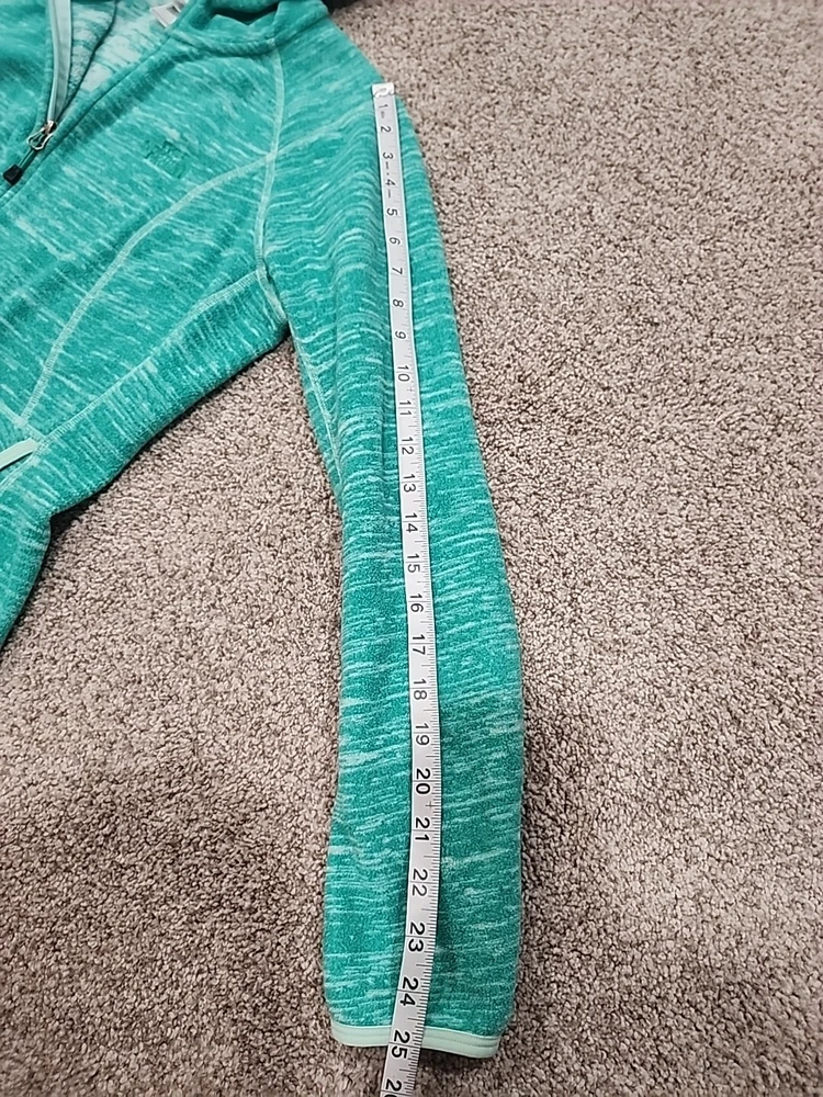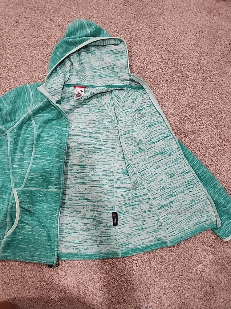 Jacket in excellent condition with no rips or stains. Measurements on photos. This North Face jacket for women is a must-have for any outdoor activity. The hooded and full zip design makes it perfect for fall, winter, and spring seasons. The jacket is made of 100% polyester and features a fleece fabric type with a solid pattern. It comes in a beautiful sea foam green color with a zipper and logo accent. The jacket is machine washable and has a regular fit. It is perfect for travel and casual occasions. The long sleeve and short length make it suitable for any height. Get this basic jacket now and enjoy the comfort and style it provides.