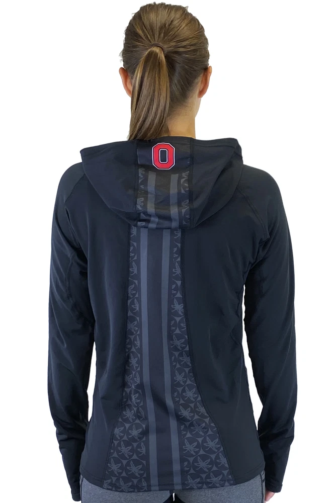 Our OSU Buckeye performance pony tail hood is made of breathable soft fabric that is light weight and durable . This full zip hoodie is complete with thumb holes and hole in hood for a ponytail. Great for morning runs or just everyday wear! Lightweight Performance Material Embroidered Ohio State Logo on Left Arm Helmet Stripe detail down back