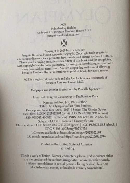 gtin13: 9780451466822 Item Weight: 30.1 Oz ISBN: 9780451466822 Book Series: The Cinder Spires Ser. Publication Year: 2023 Author: Jim Butcher Language: English Signed: Yes Intended Audience: Adults Topic: Science Fiction / Steampunk, Fantasy / Historical, Action & Adventure, Fantasy / Epic Genre: Fiction Item Width: 6.3 in Country/Region of Manufacture: United States Signed By: Jim Butcher Item Length: 9.3 in Ex Libris: No Book Title: Olympian Affair Publisher: Penguin Publishing Group Personalized: No Number of Pages: 624 Pages Original Language: English Type: Novel Vintage: No Format: Hardcover Edition: First Edition, First Printing Personalize: No Narrative Type: Fiction Item Height: 1.9 in Inscribed: No