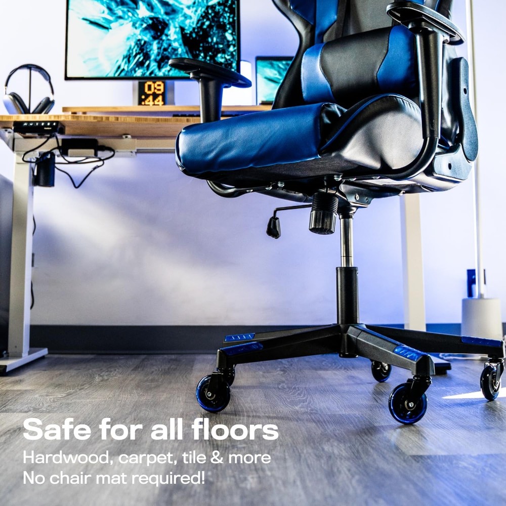 ★ U.S. PATENT PENDING - Designed and engineered in Columbus, Ohio, our blue chair wheels are safe for all floors. Encased with soft, polyurethane material, they are guaranteed not to scratch or leave marks on any surface (including hardwood, carpet, tile, laminate and more). ★ QUICK AND EASY INSTALLATION - No tools required! Easily remove and replace the wheels in your desk chair in less than 30 seconds. Simply pull out your old caster wheels and pop these in. Check out our quick replacement video for more details. ★ UNIVERSAL SIZE - Upgrade any rolling office chair with these smooth caster wheels. The universal size stem will fit almost every office chair on the market. If for some reason they don’t fit your specific chair, we’ll take care of you. ★ SUPPORTS UP TO 650 LBS - Manufactured with the best available materials these casters are built to last a lifetime. Heat treated high-grade steel, precision ball bearings, and durable polyurethane provide years of effortless rolling. The heavy duty chair wheels easily support 650 lbs.