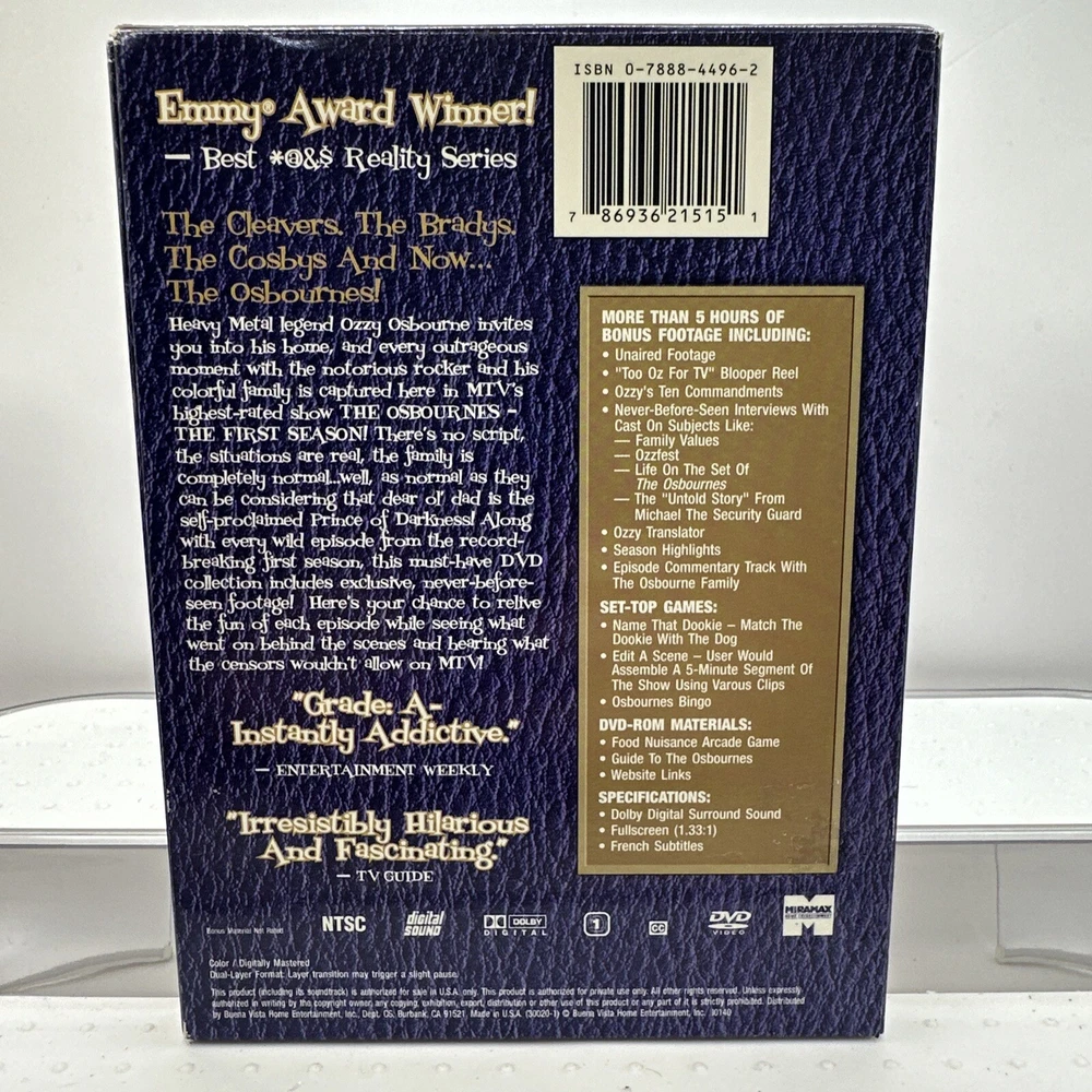 Rating:NRUPC:0786936215151Movie/TV Title:Osbournes-The First SeasonSeller Notes:“Pre-owned in good condition.”Release Year:2003Edition:UncensoredActor:Kelly Osbourne, Sharon Osbourne, Ozzy Osbourne, Jack Osbournegtin13:0786936215151Format:DVDGenre:Comedy