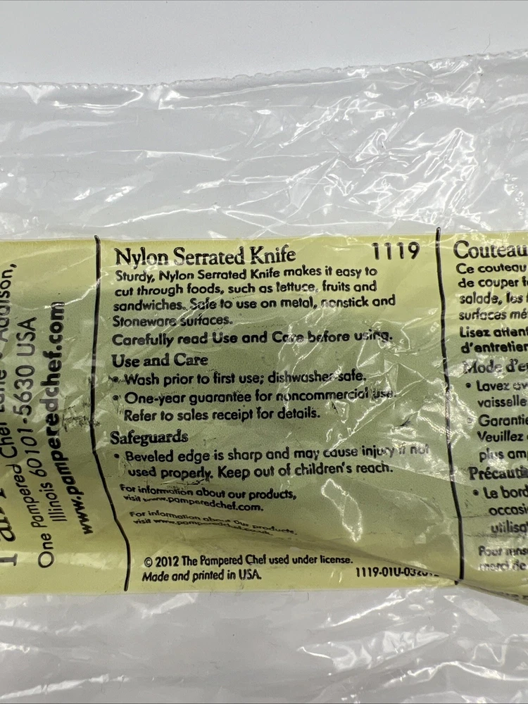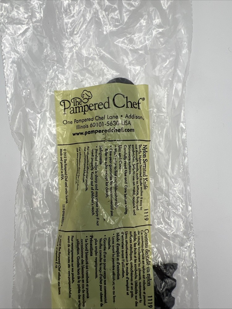 The Pampered Chef #1119 Kitchen Serrated Salad Knife is a versatile tool designed for slicing lettuce and other salad ingredients. With a blade length of 11 inches and a serrated edge, this black nylon knife is perfect for effortlessly cutting through greens without crushing them. The knife is a single item in the set and is specifically designed for salad preparation, making it a must-have in any kitchen for serving up fresh and crisp salads with ease.