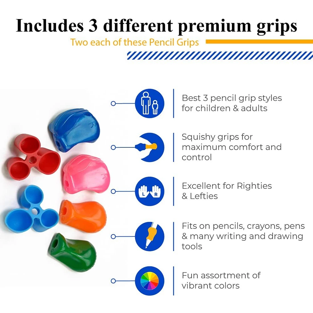 The Pencil Grips were designed by a doctor & are widely used in classrooms, at home, & in therapeutic settings. The unique shapes of these pencil grippers are designed to be “one size fits all” to help the hands of kids & adults, & works for both righties & lefties. These pencil assists can be used as a training tool, and then permanently for added comfort. These ergonomic hand grippers fit on pencils, primary pencils, pens, crayons, markers, paint brushes, etc., so its benefits can be widely enjoyed. A comfortable hand has more control & shows improved handwriting. These colorful pencil grippers guide the hand into an ergonomic position. The shaped pencil holders relieve pain, fatigue, reduce white knuckling & improve comfort. This beginner’s pack comes with two each of 3 different grip styles that are most recommended for the early childhood stage. The pack contains the Small Size Claw Grip, Crossover Grip and Pinch Grip. The Pencil Grip offers the best writing aid for your little ones. This pack contains 6 grips in a fun assortment of vibrant colors. Pencil Gripper: The Pencil Grips were designed by a doctor & are widely used in classrooms, at home, & in therapeutic settings. The unique shapes are designed to be “one size fits all” to help the hands of kids & adults, & works for righties & lefties. Ergonomic Hand Grippers: These pencil assists can be used as a training tool, and then permanently for added comfort. These grips fit on pencils, primary pencils, pens, crayons, markers, paint brushes, etc., so its benefits can be widely enjoyed. Colorful Pencil Grippers: A comfortable hand has more control & shows improved handwriting. These grips guide the hand into an ergonomic position. They relieve pain, fatigue, reduce white knuckling & improve comfort. Shaped Pencil Holder: This beginner’s pack comes with two each of 3 different grip styles that are most recommended for the early childhood stage. The pack contains the Small Size Claw Grip, Crossover Grip and Pinch Grip. Writing Aids: The Pencil Grip offers the best writing aid for your little ones. This pack contains 6 grips in a fun assortment of vibrant colors.