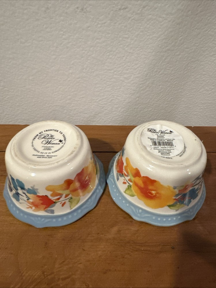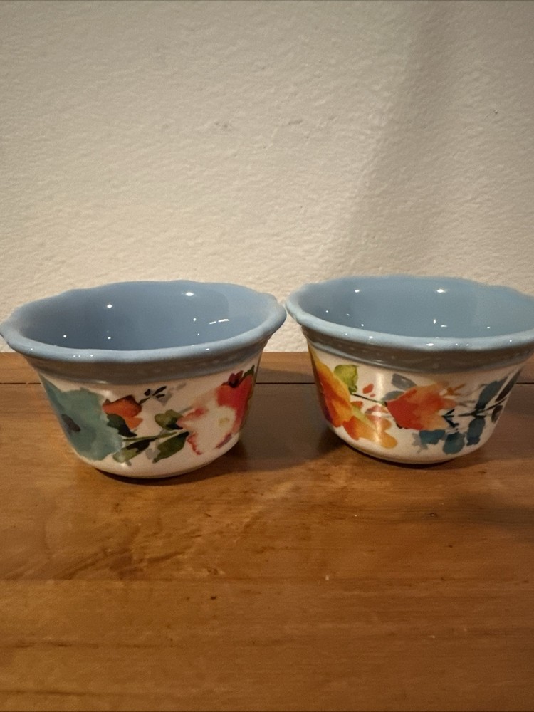 The Pioneer Woman 2 Stoneware Scalloped Ramekin Bowl in Blue Willow Floral pattern is a set of dipping bowls manufactured in 2015. These round bowls are made of durable stoneware and feature a beautiful blue color with a floral design, adding a touch of elegance to your dining experience. Perfect for serving sauces, condiments, or small snacks, these ramekin bowls are both functional and stylish, making them a charming addition to your kitchen or dining table.