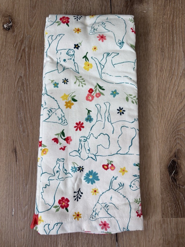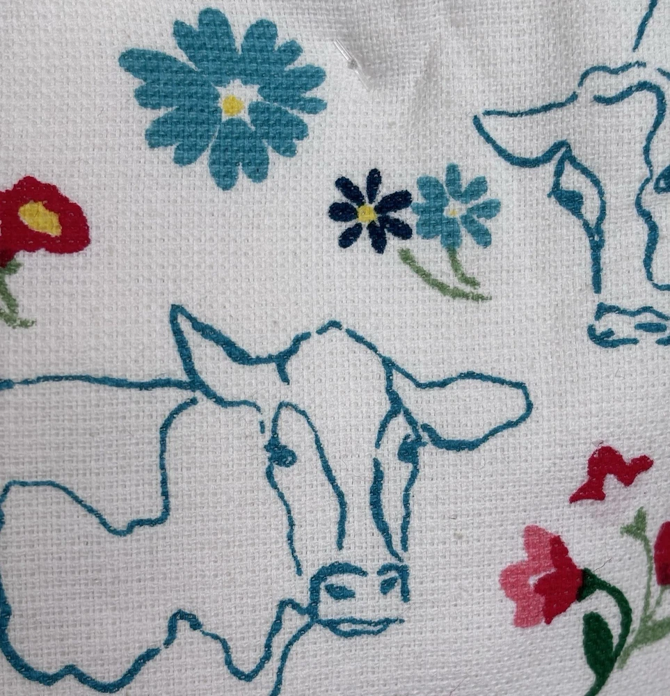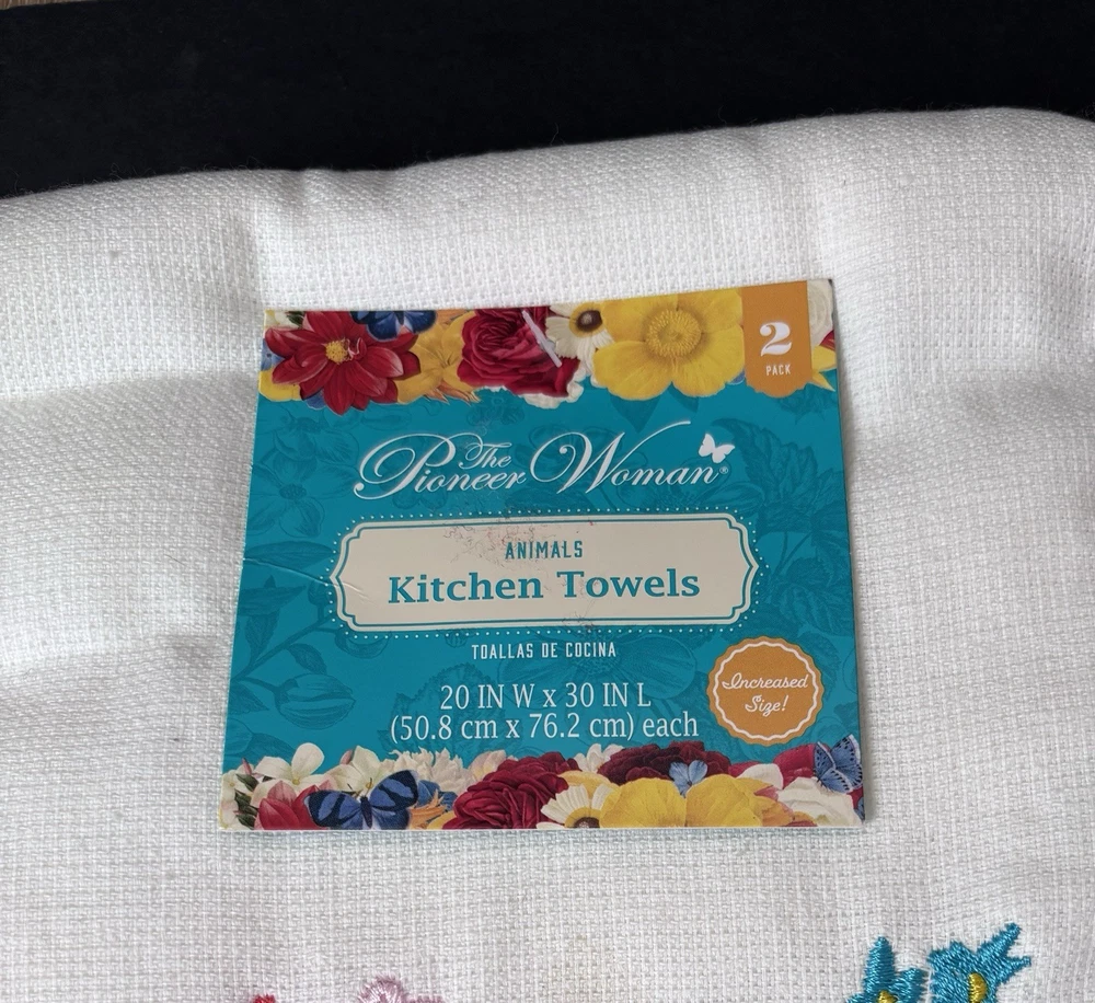 The Pioneer Woman 2pc 100% cotton kitchen towel set. Tea towel style in vibrant & rich colors turquoise, coral, yellow and green with a floral theme. In classic Pioneer Woman fashion there is a dainty ruffle on the front of each towel. There are also pretty flowers, a cow shape, and the phrase “I’ll love you till the cows come home embroidered on the front of one, and a cute farmhouse animal print all over the other. Each towel measures 30”L x20”W