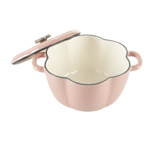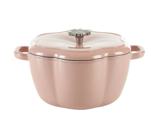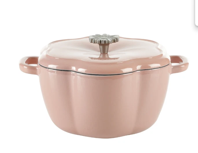 DESCRIPTION: The Pioneer Woman's Timeless Beauty collection 3-quart Dutch oven with lid Dutch oven and lid feature a gorgeous floral shape in a delightful pink color Cast iron body distributes heat evenly Interior condensation ridges on lid allow for self-basting Interchangeable Bakelite knob is heat-resistant and stays cool Constructed of durable enameled cast iron Safe for use on gas, electric, and induction stove-tops, on the grill, and in the oven Hand wash only Coordinates with other pieces from The Pioneer Woman's Timeless Beauty collection