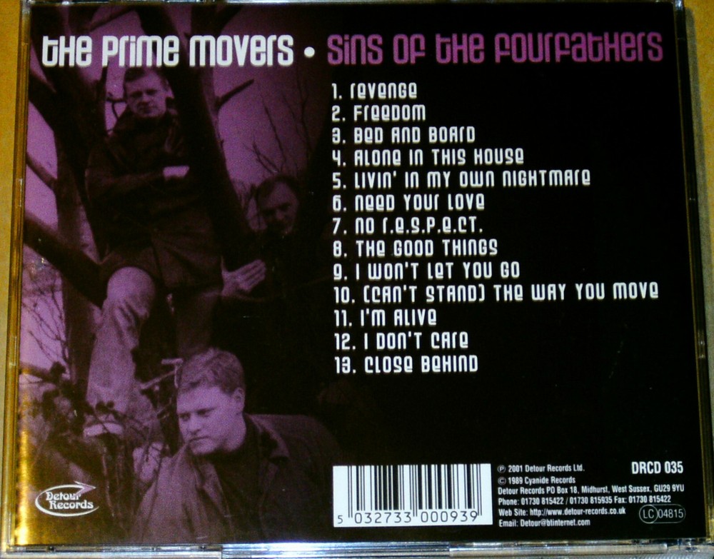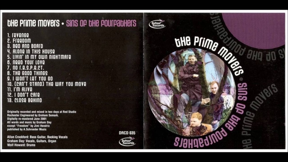 . Rare & Out-Of-Print Digitally Re-Mastered June 2001Reissue, on the UK "Detour Records" label. The Prisoners split in 1986 after four albums and the sadly inevitable music-industry-induced agony, but the Day / Crockford partnership didn’t stay dormant for long. After a stint as drummer for the Mighty Caesars with Chatham’s very own Renaissance man Billy Childish, Graham Day was re-joined by his old partner in 1989, along with ex-Daggerman Wolf Howard on drums, and formed the Prime Movers. Allan and Wolf had been part of the original line-up of the James Taylor Quartet (formed after the Prisoners split), but were now free agents. The Prime Movers recorded the raw and unpolished ‘Sins of the Fourfathers’ as a three piece. The album took only two days to record & mix, and consequently is almost live, hard-hitting and without compromise!!! Graham Day’s The Prime Movers were a continuation of story that have started with The Prisoners, this time with more psychedelic influences. ‘Sins of the Fourfathers’ is a killer garage slab, maybe one of the best in Mr.Day’s arsenal [for my money one of the best in ’80s garage revival movement]. Merging of 60’s freakbeat/mod influences, Hendrix guitar style & wah wah pedal swirl with punk energy proved as a winning combination. All tunes are originals except the cover of Hendrix’s ”Freedom”. THE JEWEL CASE, INSERT AND CD ARE IN ALL IN VERY GOOD CONDITION, WITH ONLY MINOR COSMETIC / SURFACE WEAR THROUGHOUT.