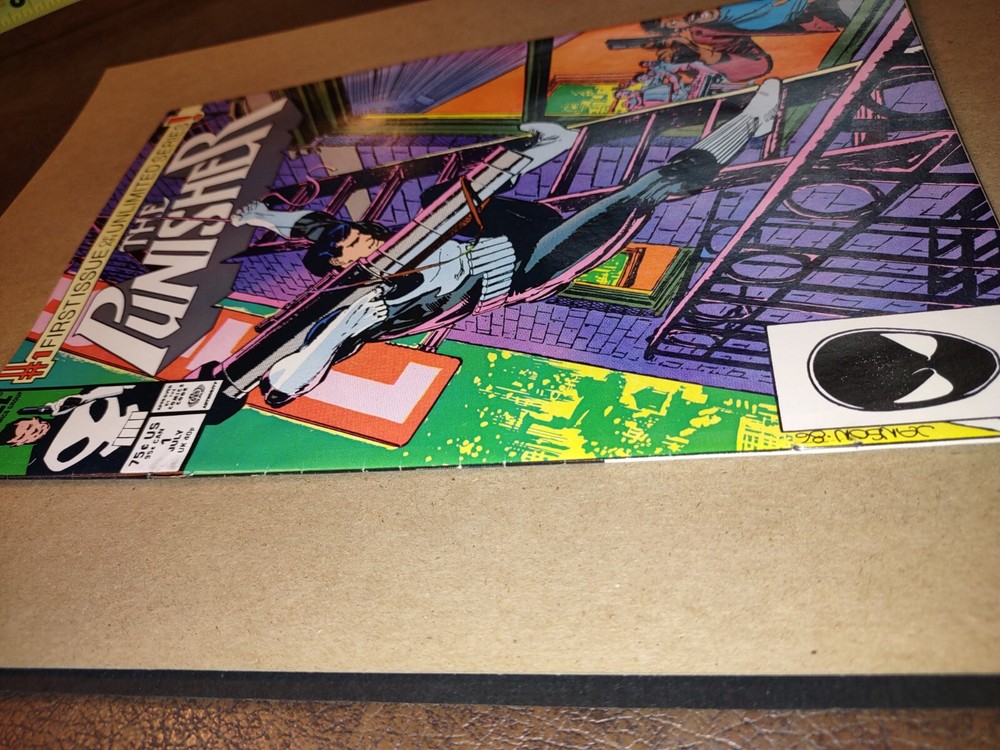 "The Punisher #1" is a Marvel Comics issue from July 1987 in the Copper Age era. The comic features characters like Punisher, Curtis Hoyle, Wilfred Sobel, Belinda Foster, and Hector Gomez. Written by Mike Baron and illustrated by Klaus Janson, this crime and superhero genre comic is in English and part of "The Punisher" series. The cover artist is Klaus Janson. This issue is in ungraded Near Mint/Mint Condition. The pages have never been opened up. Spine has no creases or cracks.