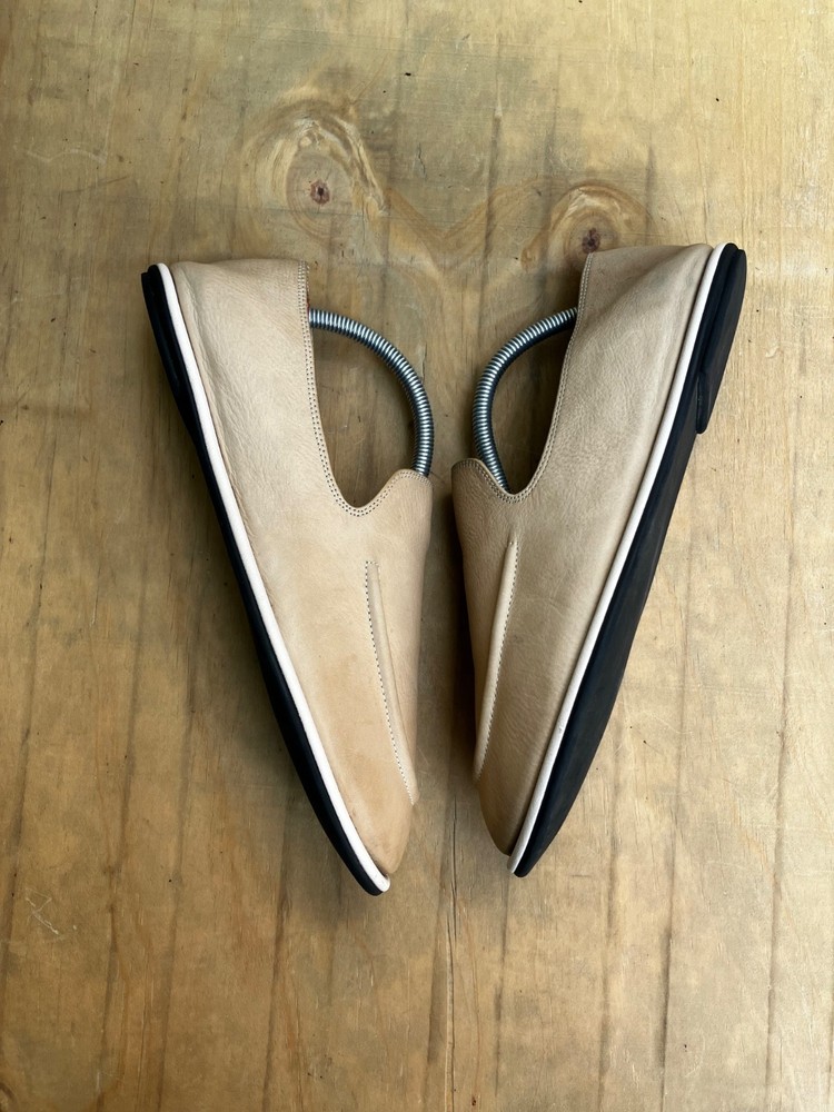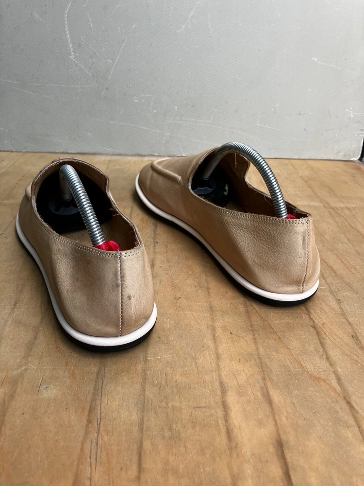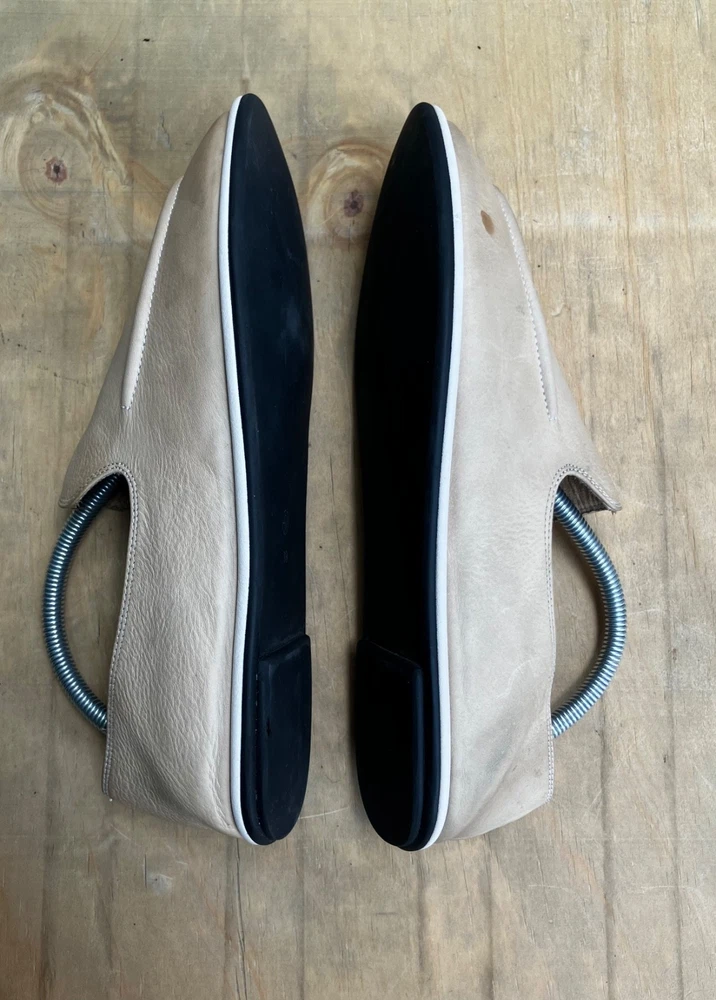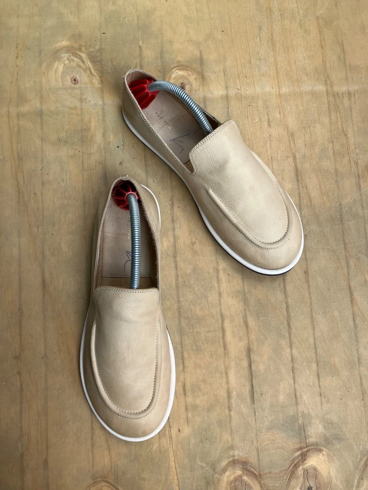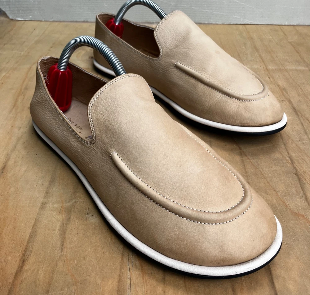 These The ROW Canal Leather Beige Loafers in Women's Size 39 EU/9 US are a stylish and comfortable choice for casual occasions. With a round toe shape, slip-on closure, and lightweight design, they are perfect for the summer and spring seasons. Made with high-quality leather and a rubber outsole, these loafers feature a logo accent and a solid beige color. The angel-themed design adds a touch of personality, making them a versatile and fashionable option for any woman's wardrobe.