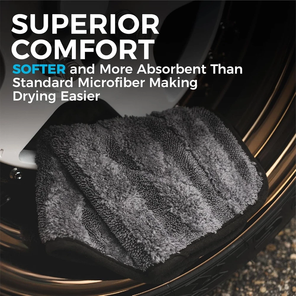 Car Drying Towel - 70/30 Korean Microfiber, Dries Faster Without Scratching, 900gsm, 12x12 inches, Ice Grey/Grey, 3 Pack PREMIUM PATENTED HYBRID TWIST LOOP for drying your vehicle quickly. Safely draws moisture away from the surface and into the patented twist/plush fiber design of the towel. One of the most absorbent towels by weight that we have ever tested (10x+ other towels). These make the perfect microfiber towels for cars. FASTER, SAFER DRYING - 70/30 blend 900gsm professional microfiber drying towel with over 500,000 fibers per square inch and our trademarked "ButterSoft" suede microfiber border that is absorbent and won’t scratch paint, glass, or plastic. Our microfiber towel is no joke! FINEST QUALITY - 100% South Korean super plush AA-grade split microfiber. Long considered the highest quality available, it can withstand hundreds of washes, getting softer each time making it the perfect car drying towel. MULTIPLE SIZES FOR ANY JOB - Use the small rag to dry small nooks and crannies while the largest towel can dry large surface panels and windows with ease. Gauntlet car drying towel, The Rag Company microfiber towel, 70/30 Korean microfiber drying towel, premium car drying cloth, plush car wash towel, auto detailing drying towel, high absorbency car towel, car wash drying cloth, microfiber car care towel.