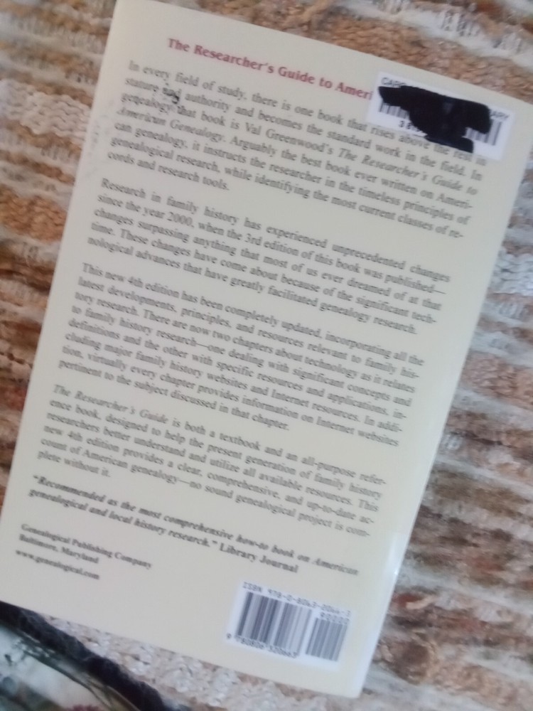 Source Language: English Book Title: The Researcher's Guide to American Genealogy. 4th Edition Publication Year: 2017 Item Weight: 36.9 Oz Publication Name: Researcher's Guide to American Genealogy. 4th Edition Subject: Genealogy & Heraldry, Library & Information Science / Archives & Special Libraries ISBN: 9780806320663 Author: Val D. Greenwood MPN: Does not apply Features: Ex-Library Country/Region of Manufacture: United States Publisher: Genealogical.Com Seller Notes: “ex-library book with almost no wear, just a smudge on the top leaf edge and voided library markings.” gtin13: 9780806320663 Number of Pages: Xvi, 778 Pages Item Height: 1.6 in Language: English Subject Area: Référence, Language Arts & Disciplines Brand: Unbranded Format: Trade Paperback Personalized: No Item Width: 6 in Item Length: 9 in Type: Answer Book